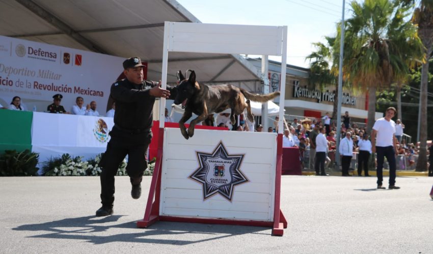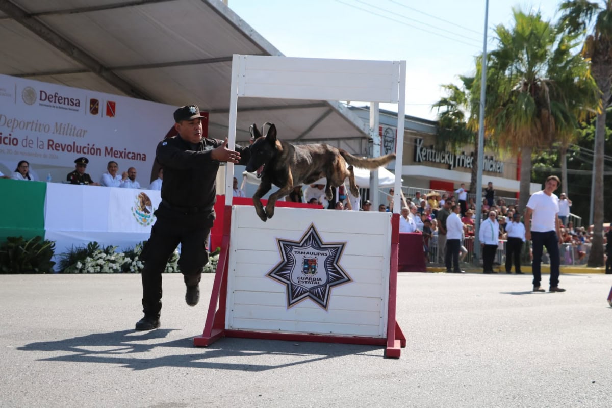 Conformado por binomios policiales, especializados en búsqueda de papel moneda, narcóticos, restos óseos y artefactos explosivos, el agrupamiento canino de la Guardia Estatal se unió a este acto cívico demostrando parte del entrenamiento de sus integrantes.