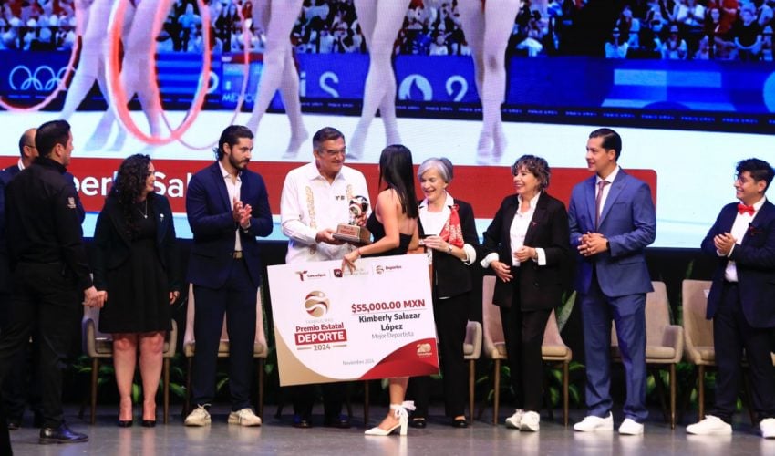 En lo referente a la entrega del Premio Estatal del Deporte, el gobernador Américo Villarreal entregó la máxima distinción del 2024 a la gimnasta de Tampico, Kimberly Salazar López, quien participó en los Juegos Olímpicos de París, además de contar en su récord con 2 medallas de oro y una de plata en el Campeonato Panamericano de Guatemala y 3 Medallas de plata en Pharaohs Cup Egipto 2024.