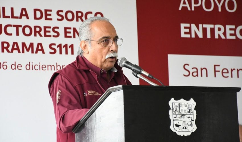 Eliseo Camacho Nieto, subsecretario de Desarrollo Agrícola, señaló: «Amigas y amigos productores, quiero agradecerles que estén aquí presentes en esta entrega de apoyos. Desde el inicio de la administración, la Secretaría se ha dado a la tarea de restablecer la coordinación que se había perdido con el gobierno federal y estatal, y comentarles que estamos buscando alternativas que reemplacen el cultivo del sorgo o hagan más rentable su actividad».