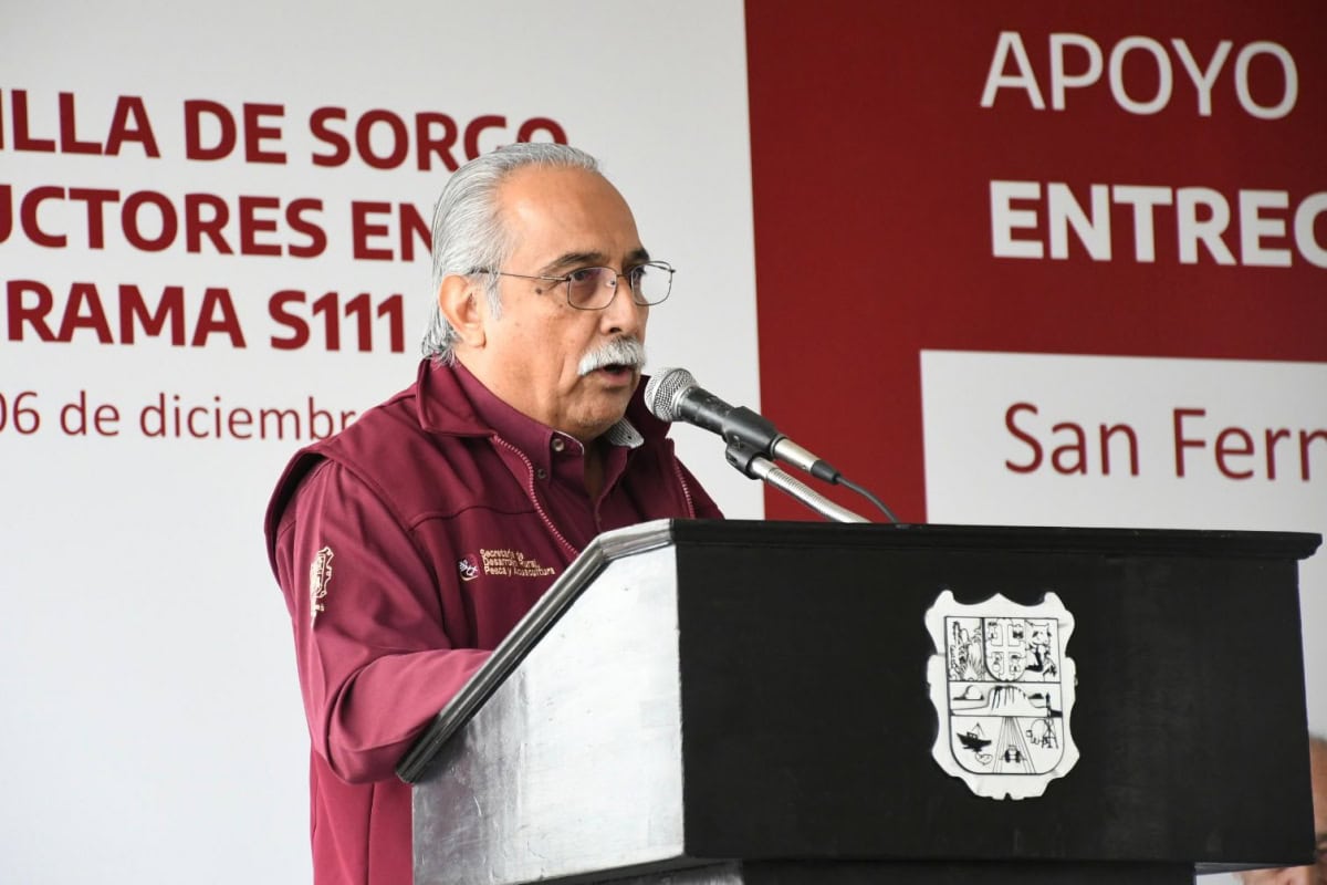 Al encabezar la entrega, el secretario de Desarrollo Rural, Pesca y Acuacultura, Antonio Varela Flores, señaló que se está dando continuidad a la entrega de apoyos de semilla de sorgo y diésel, instrucción del gobernador para que el beneficio se entregara de manera conjunta con los municipios y productores. Destacó que, con la suma de voluntades y trabajando en sinergia, se busca hacer productivo el campo, mejorando la producción, productividad y comercialización de manera sostenible.