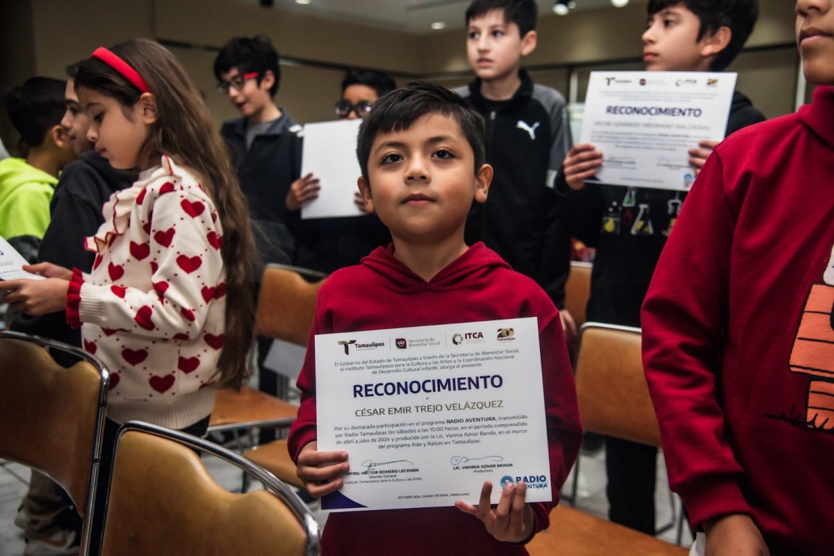 Las y los niños recibieron reconocimientos por su participación en «Radio Aventura» y «Los cueruditos y cueruditas», proyectos auspiciados por el Instituto Tamaulipeco para la Cultura y las Artes (ITCA), el programa nacional Alas y Raíces y una colaboración con Radio Tamaulipas.