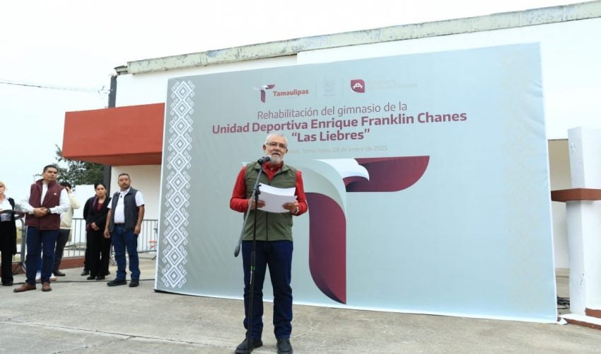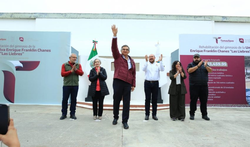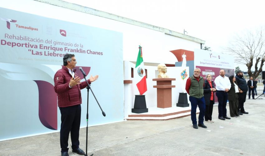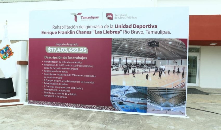 Río Bravo, Tamaulipas.- Con una inversión de más de 17 millones de pesos y en respuesta a una petición de la comunidad deportista de Río Bravo, el gobernador Américo Villarreal Anaya entregó esta tarde la obra de rehabilitación del gimnasio de la Unidad Deportiva Enrique Franklin Chanes «Las Liebres». Junto a la doctora María de Villarreal, presidenta del Sistema DIF Tamaulipas, el gobernador aseguró que la entrega de esta obra es un ejemplo del trabajo que realiza el Gobierno del Estado para recuperar la infraestructura deportiva que estuvo abandonada por otras administraciones.