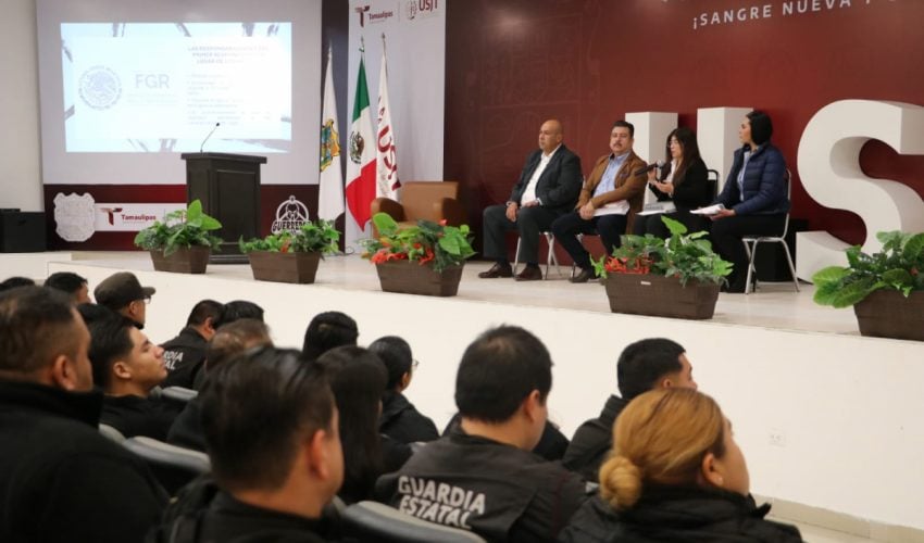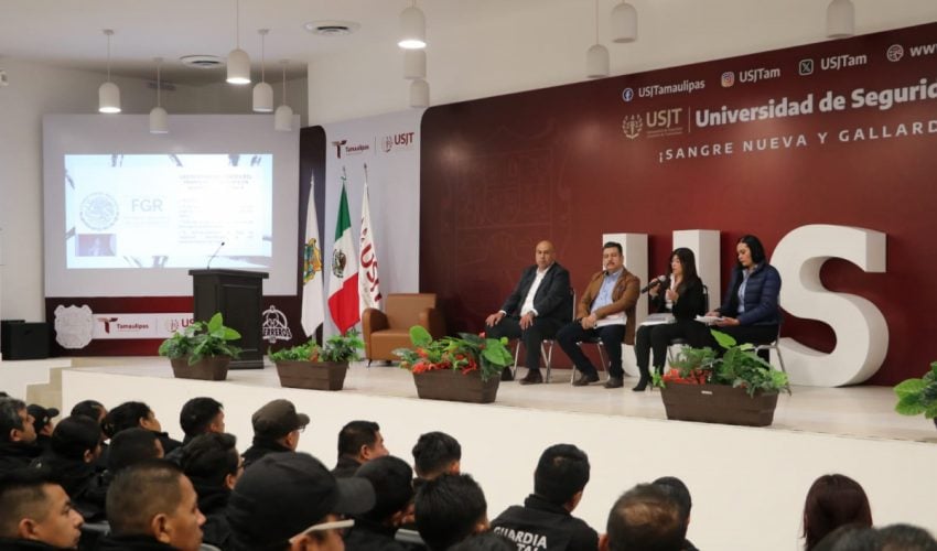 La información fue proporcionada por los Ministerios Públicos de la FGR, Denisse Vázquez Almanza, Mayra Alejandra Rodríguez Rocha y Francisco Puentes Arredondo en el auditorio de la Universidad de Seguridad y Justicia de Tamaulipas (USJT).