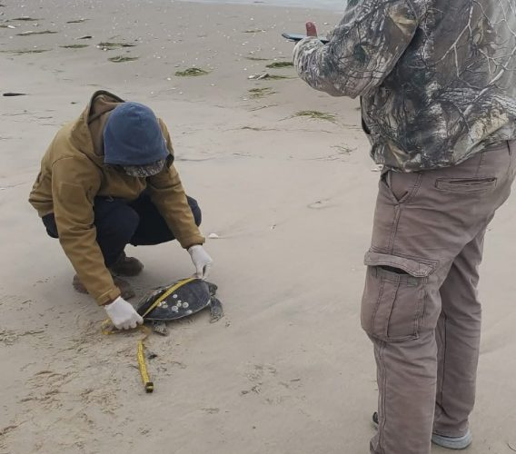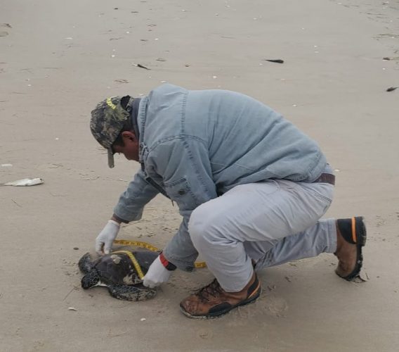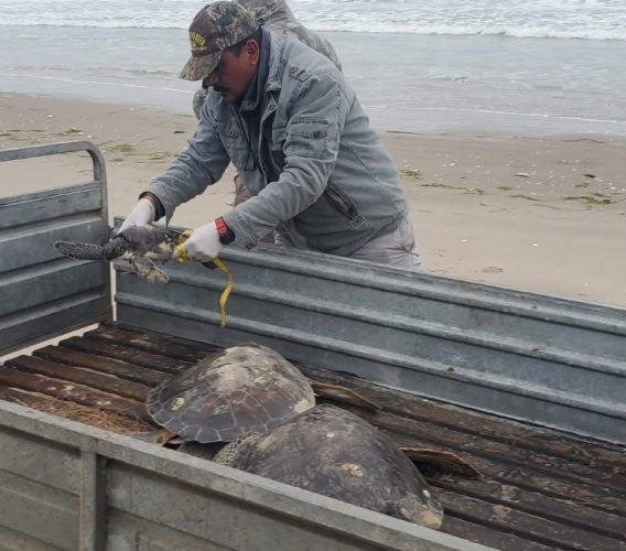 Soto La Marina, Tamaulipas.- Personal de la Comisión de Parques y Biodiversidad de Tamaulipas (CPBT) rescató 40 ejemplares tortuga verde (Chelonia mydas), que estaban varadas por las secuelas de la onda gélida que afecta al estado.