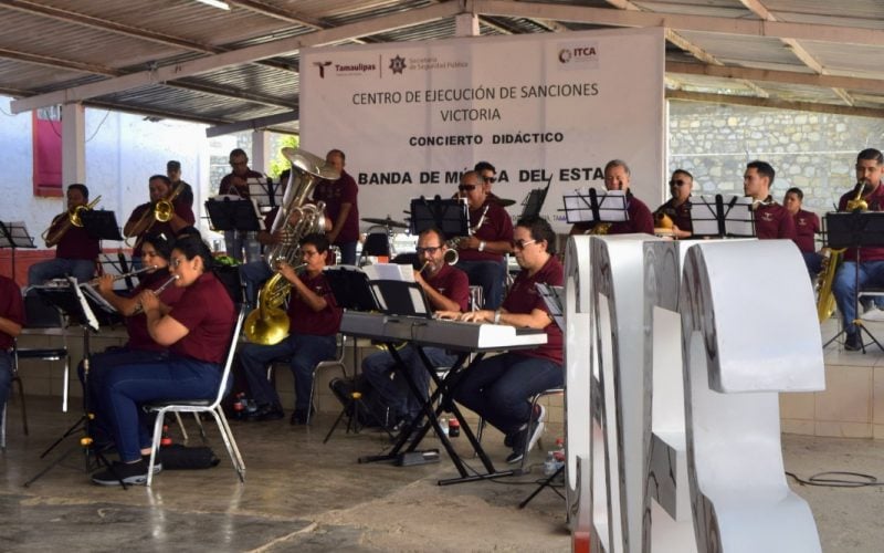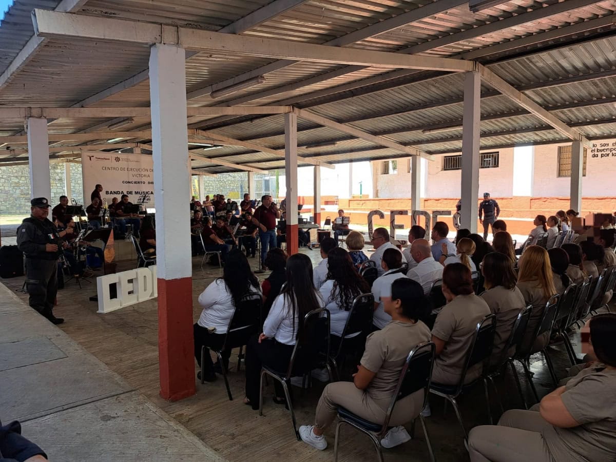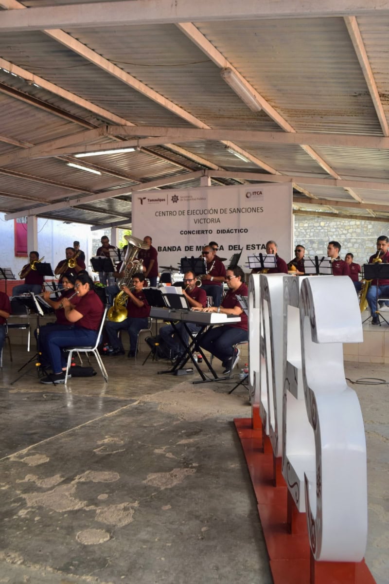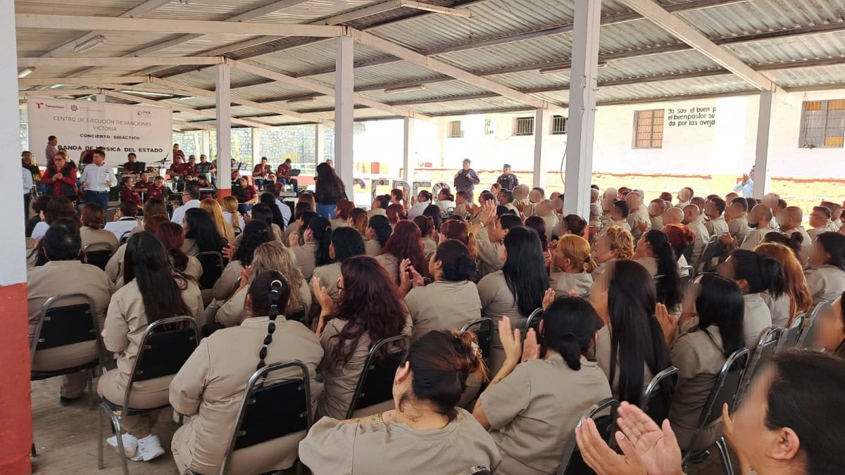 Ciudad Victoria, Tamaulipas.-Por primera vez en su historia, personas privadas de la libertad (PPLs) disfrutaron de un concierto al interior del Centro de Ejecución de Sanciones (CEDES) de Ciudad Victoria a cargo de la Banda de Música del Gobierno del Estado de Tamaulipas, ensamble que presentó piezas representativas de la entidad, como “Tampico Hermoso”, “El Navegante” y “Victoria”; así como temas de Selena Quintanilla, Queen, clásicos del rock, cumbias y mambos; los cuales fueron disfrutados por un aproximado de 250 asistentes.