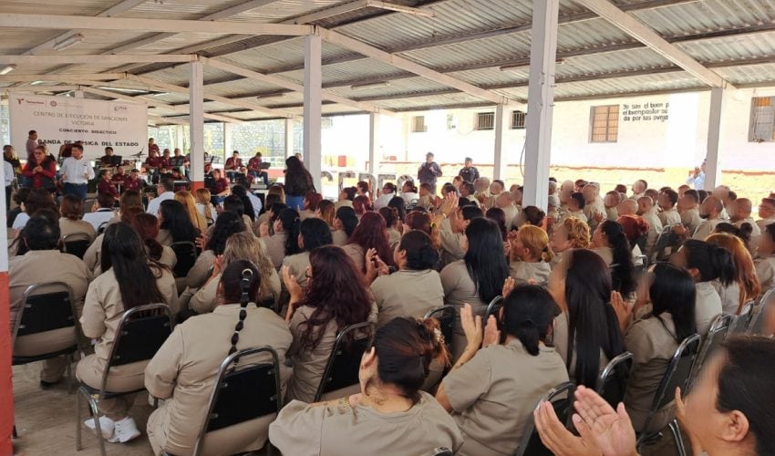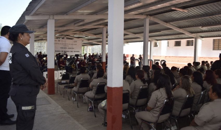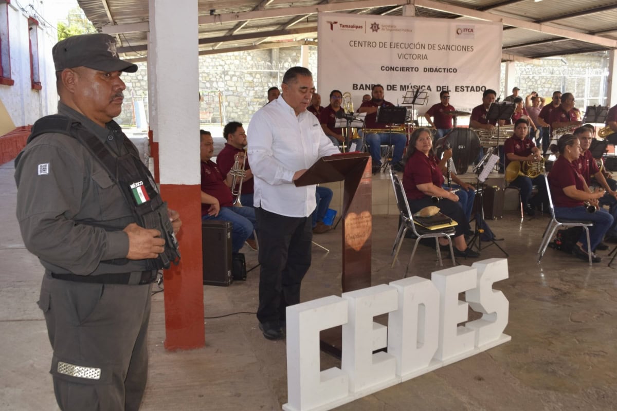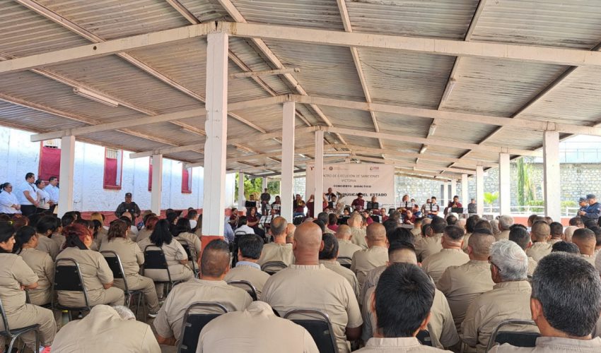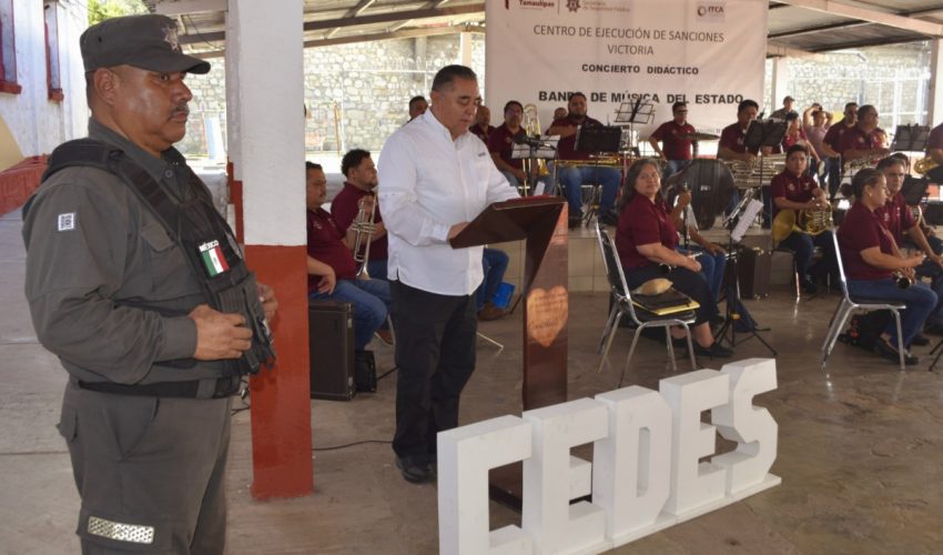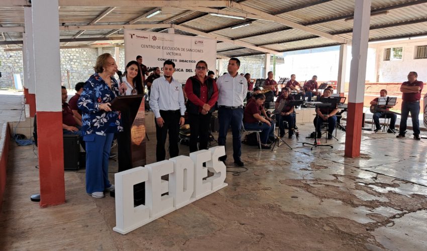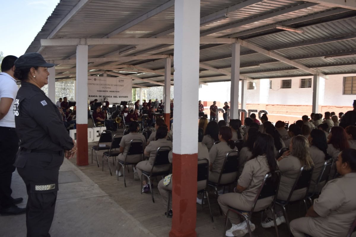 Ciudad Victoria, Tamaulipas.-Por primera vez en su historia, personas privadas de la libertad (PPLs) disfrutaron de un concierto al interior del Centro de Ejecución de Sanciones (CEDES) de Ciudad Victoria a cargo de la Banda de Música del Gobierno del Estado de Tamaulipas, ensamble que presentó piezas representativas de la entidad, como “Tampico Hermoso”, “El Navegante” y “Victoria”; así como temas de Selena Quintanilla, Queen, clásicos del rock, cumbias y mambos; los cuales fueron disfrutados por un aproximado de 250 asistentes.