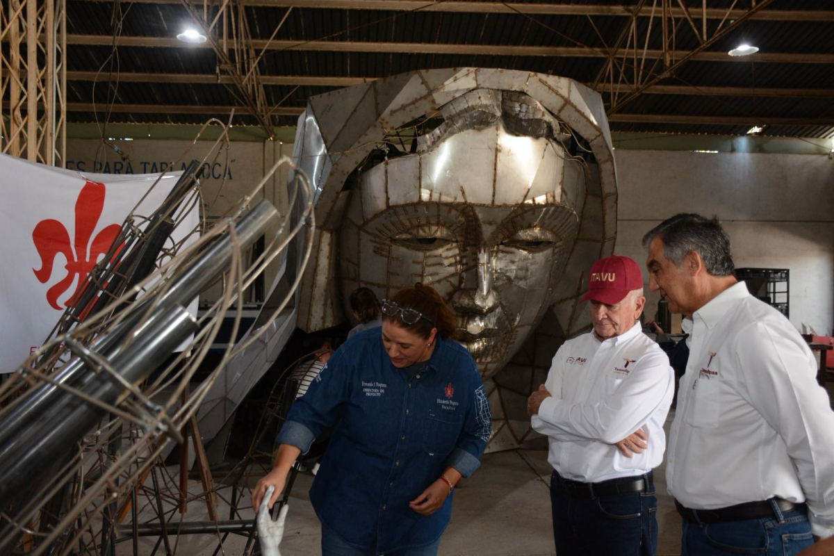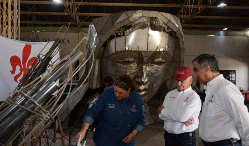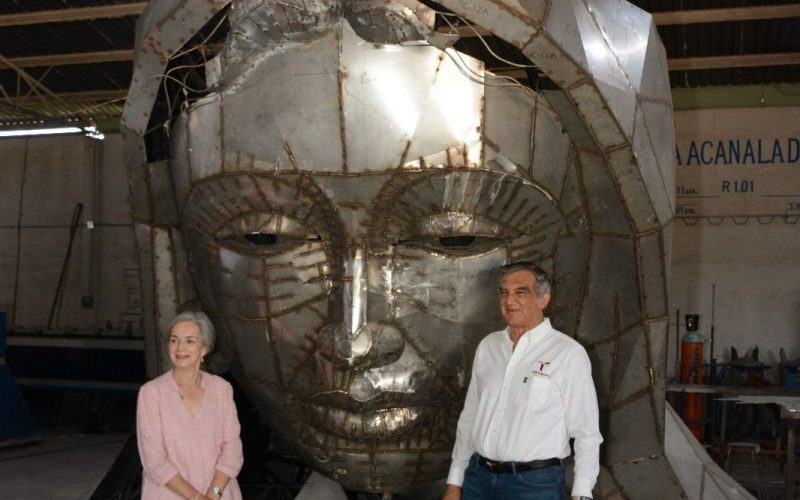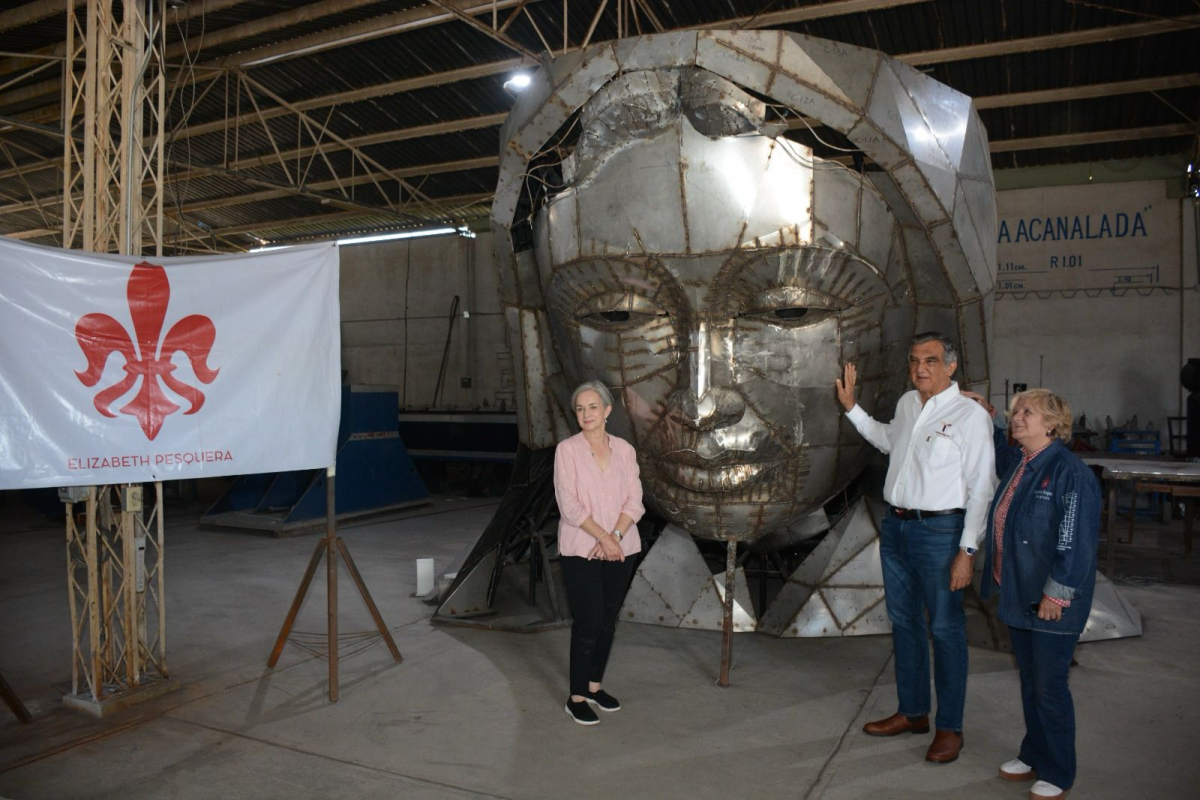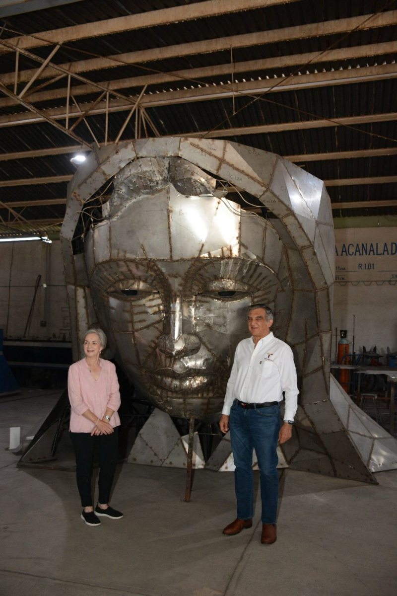 La escultora victorense Elizabeth Pesquera Caballero, acompañada por la directora del proyecto, Fernanda Saiz Pesquera, se mostró entusiasmada al informarle al gobernador que la gigantesca estructura se encuentra en la etapa de acabado.