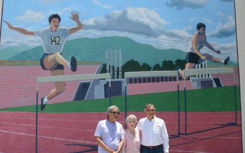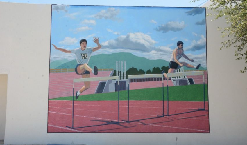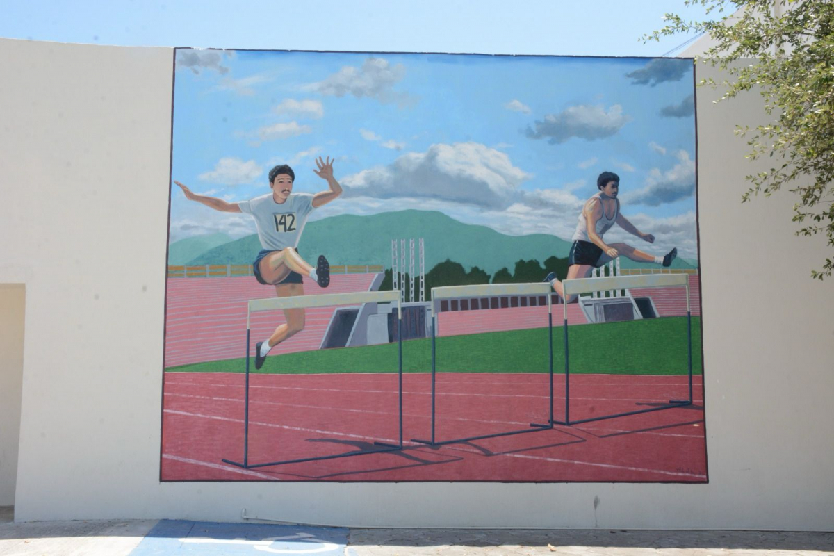 En la pintura se muestra a Villarreal Guerra participando en una prueba de atletismo con vallas, en la pista del estadio Marte R. Gómez.
