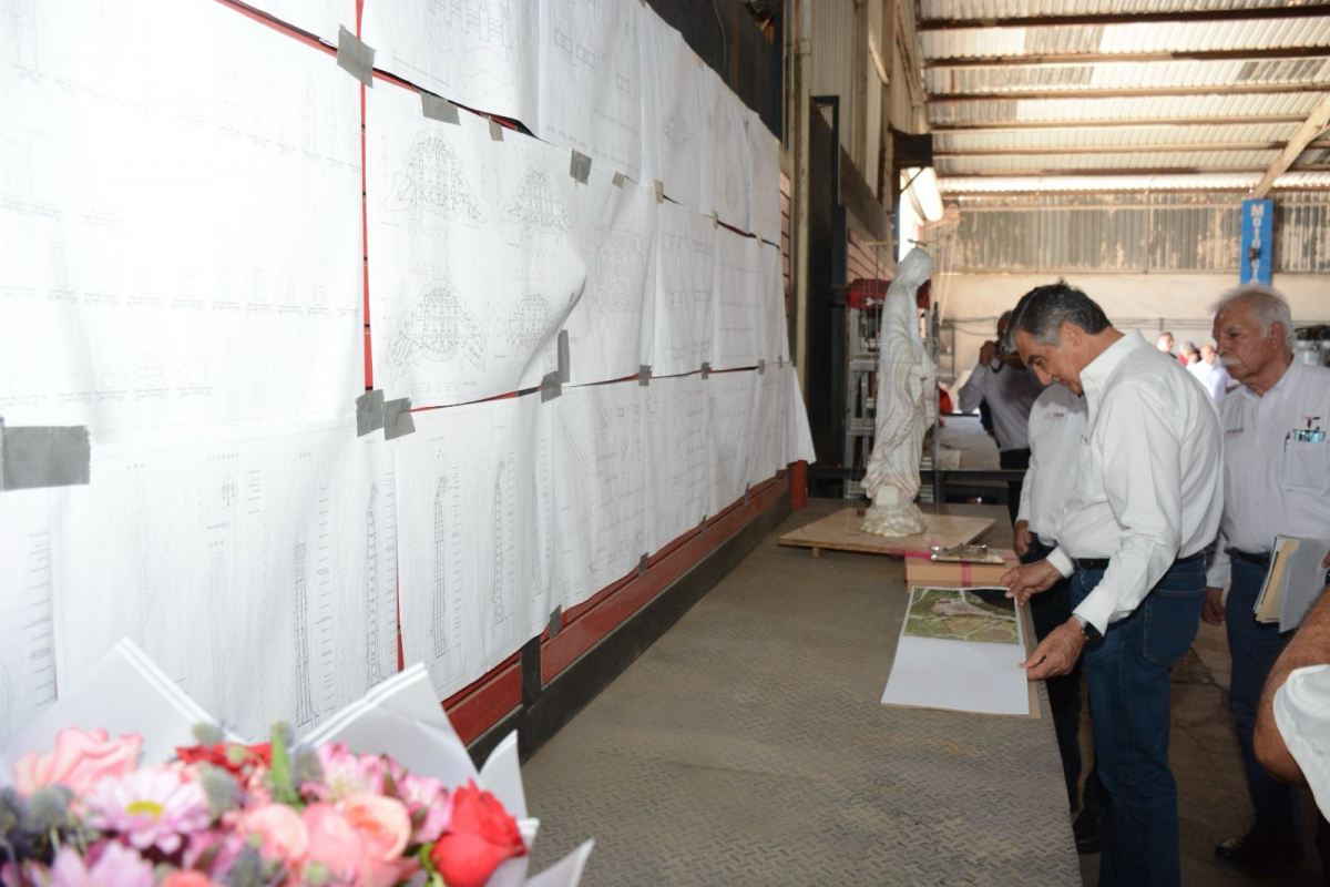 A temprana hora de este miércoles, el gobernador, acompañado por la presidenta del DIF Estatal, doctora María de Villarreal, visitó el taller en donde prácticamente ha concluido la construcción de la magna estructura metálica con la imagen de la virgen que se instalará en el santuario de El Chorrito, ubicado en el municipio de Hidalgo.