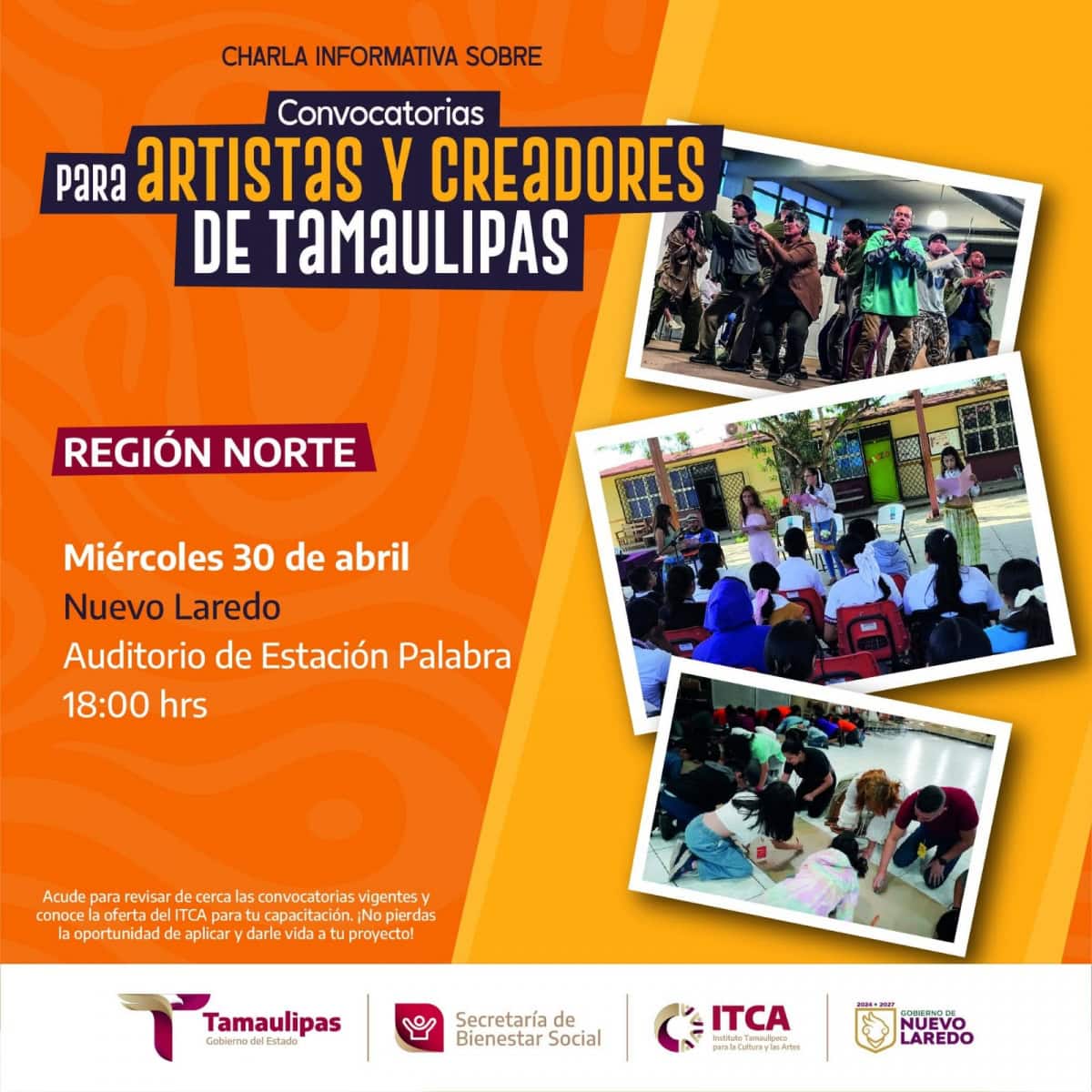 Nuevo Laredo, Tamaulipas.- Para incentivar la creación artística en la entidad, el ITCA llevará a cabo la charla «Convocatorias para artistas y creadores de Tamaulipas» este miércoles 30 de abril, a las 18:00 horas en el auditorio de Estación Palabra (Nuevo Laredo).