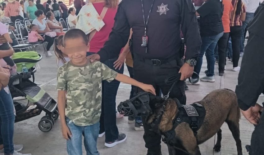 Familias asistentes se tomaron la fotografía con los binomios K-9 de la Dirección de Agrupamientos Policiales de la Secretaría de Seguridad Pública de Tamaulipas (SSPT) en este evento que reafirma la colaboración para alcanzar objetivos comunes.