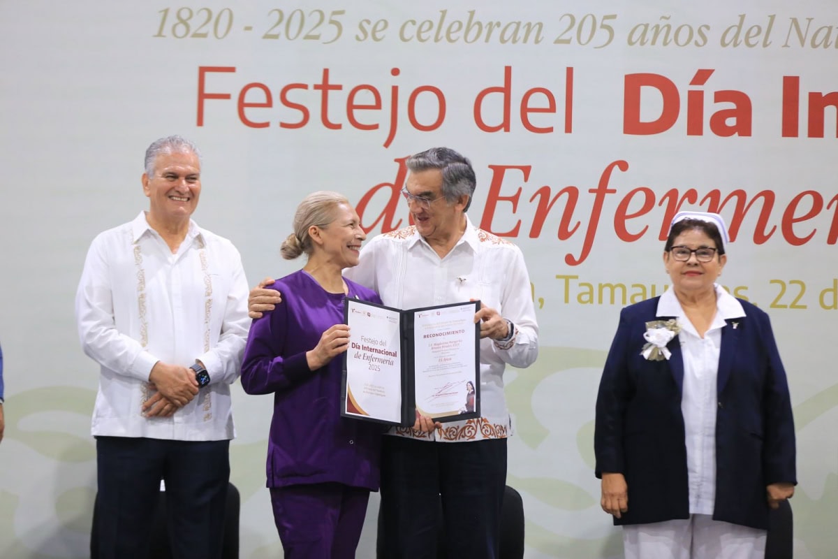 En la ceremonia, el gobernador entregó 37 reconocimientos a personal de todo el estado, incluyendo a la doctora Margarita Ortega Padrón, directora de la Escuela de Enfermería ‘Doctor José Ángel Cadena y Cadena’, de Reynosa, por su trayectoria de 50 años de servicio.