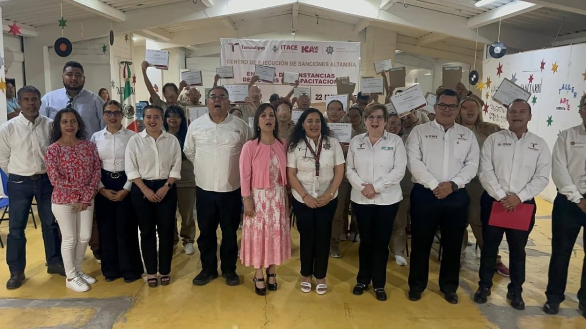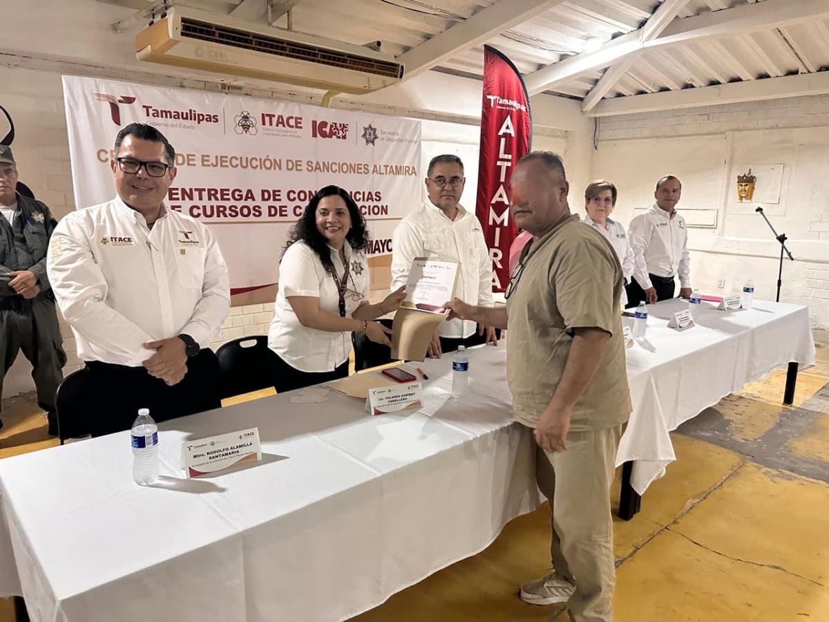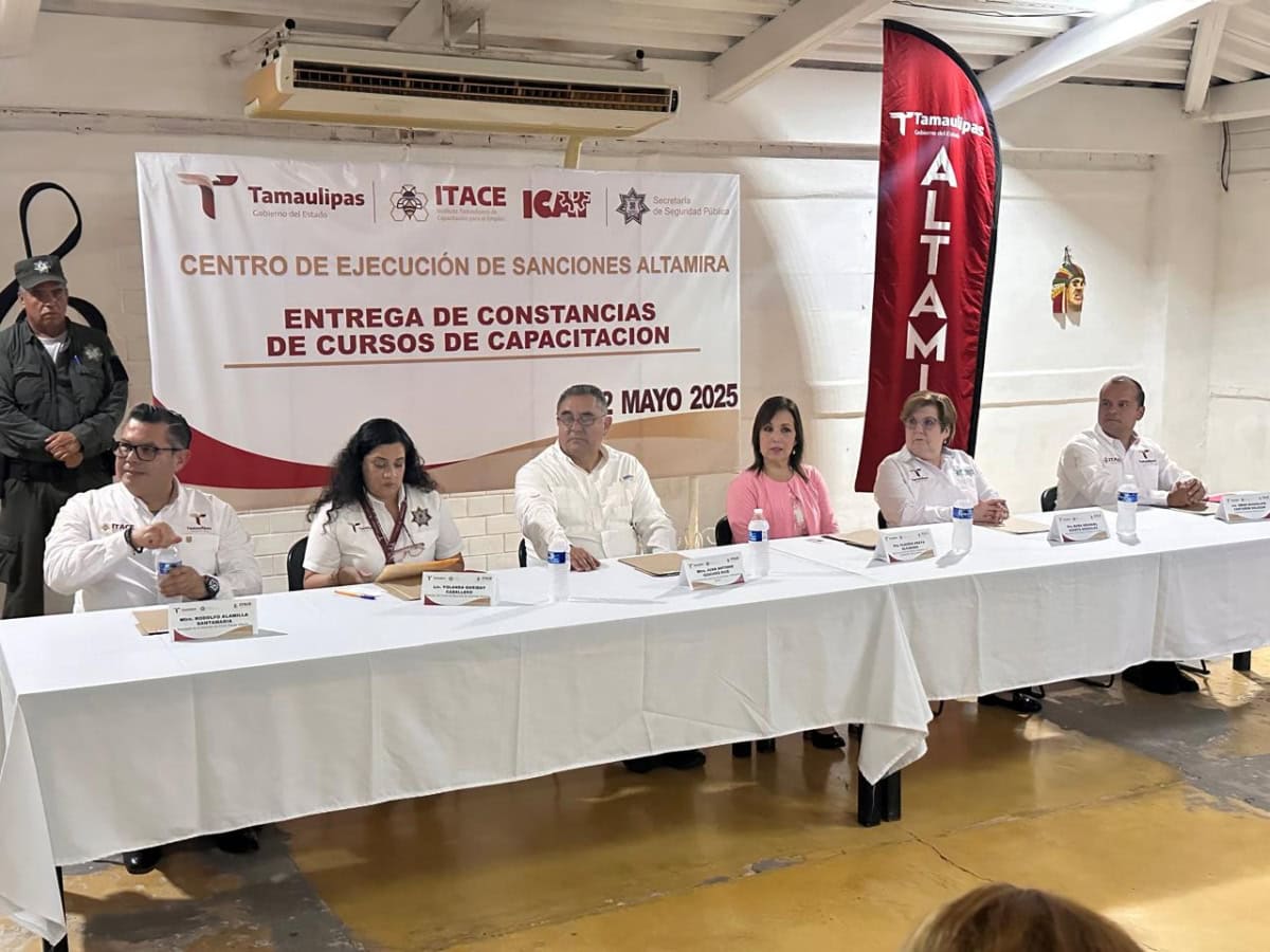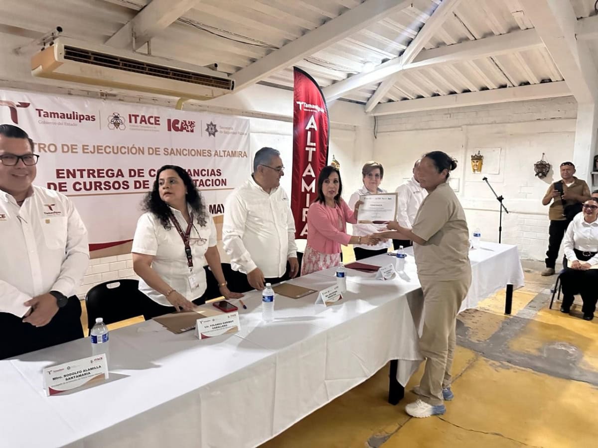 La ceremonia de entrega de constancias contó con la presencia de la directora general del ITACE, Claudia Anaya Alvarado; el subsecretario de Ejecución de Sanciones y Reinserción Social, Juan Antonio Sánchez Ruiz; la rectora de la Universidad Tecnológica de Altamira, Mara Grassiel Acosta González; la directora del CEDES Altamira, Yolanda Garibay Caballero; y Omar Guadalupe Castañón Salazar, subdirector general del Sistema ITACE.