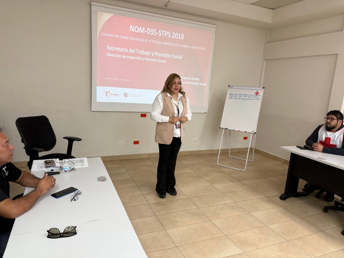 Ciudad Victoria, Tamaulipas.- Con el objetivo de fomentar un entorno laboral saludable y proteger el bienestar emocional del personal de la Cruz Roja, la Secretaría del Trabajo y Previsión Social de Tamaulipas, que encabeza Luis Gerardo Illoldi Reyes, a través de la Dirección de Inspección y Previsión Social, impartió una capacitación especializada sobre la NOM-035-STPS-2018, relativa a los factores de riesgo psicosocial en el trabajo.