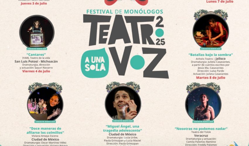-La edición del Festival de Monólogos «Teatro a una sola voz» se realizará en Tamaulipas del 3 al 9 de julio del 2025 en el teatro experimental del Centro Cultural en Nuevo Laredo, ciudad sede de este encuentro en el estado