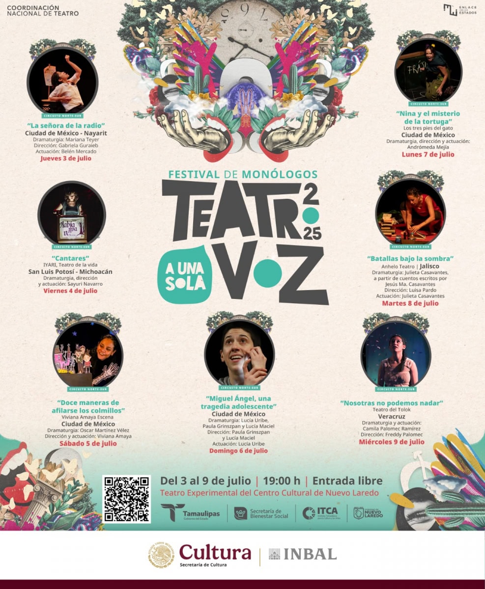 -La edición del Festival de Monólogos «Teatro a una sola voz» se realizará en Tamaulipas del 3 al 9 de julio del 2025 en el teatro experimental del Centro Cultural en Nuevo Laredo, ciudad sede de este encuentro en el estado