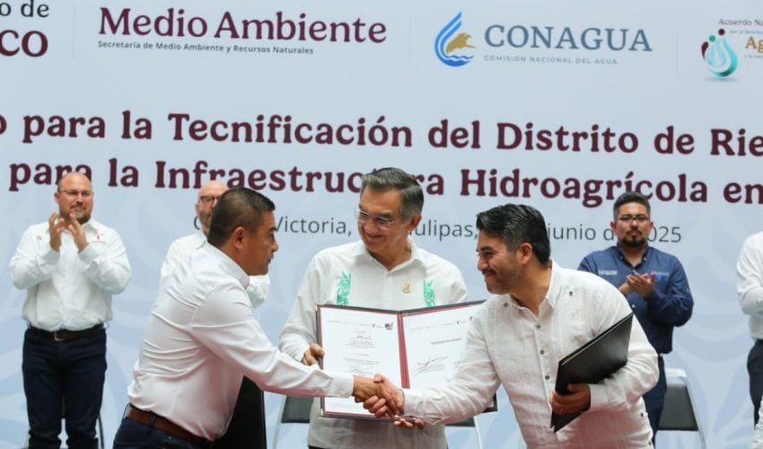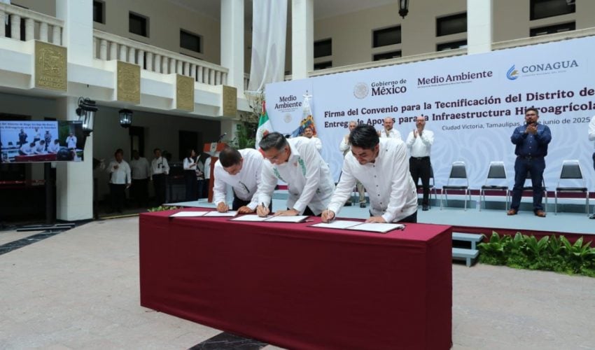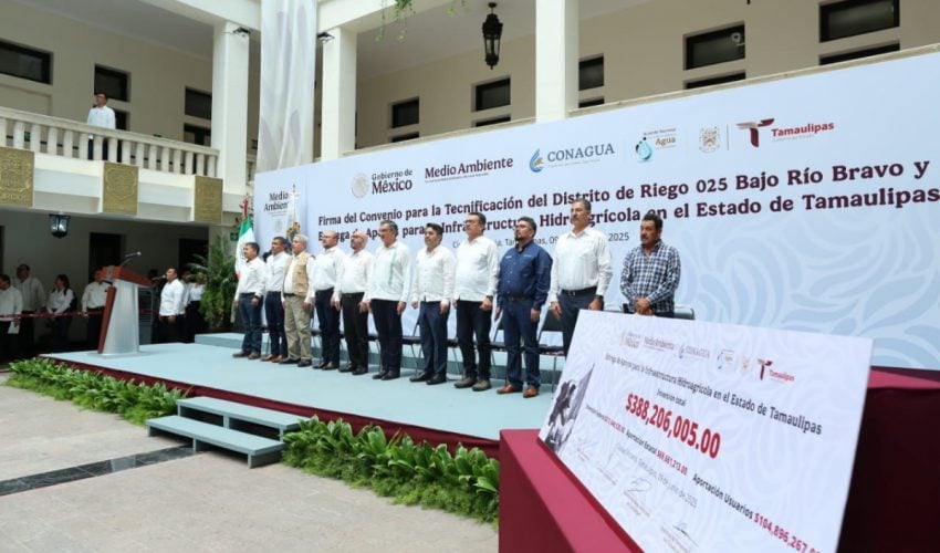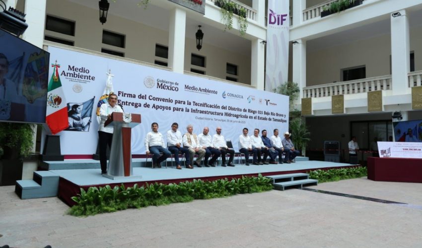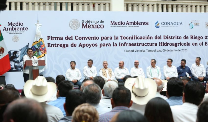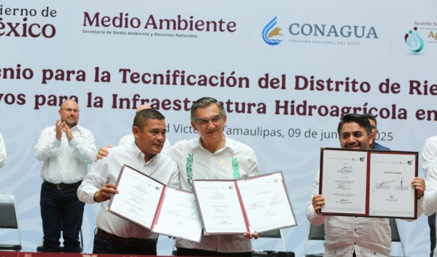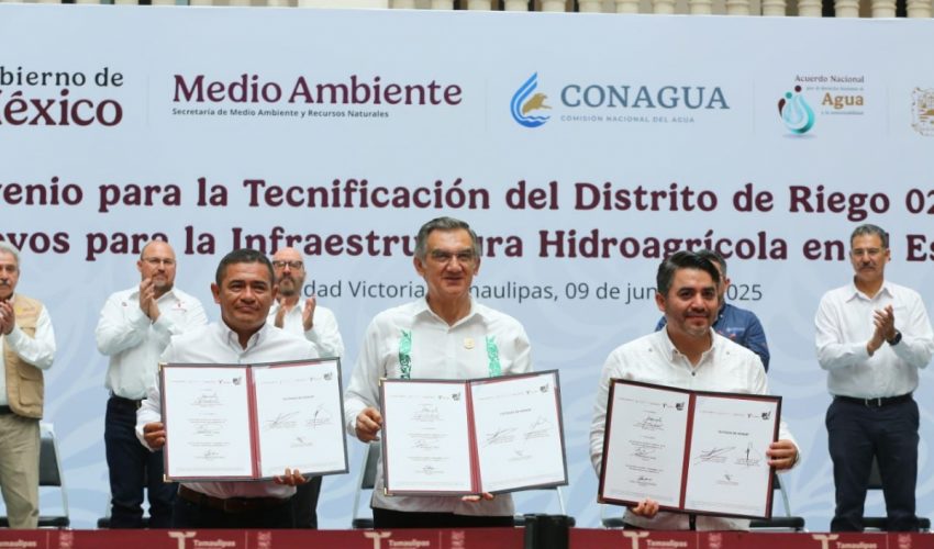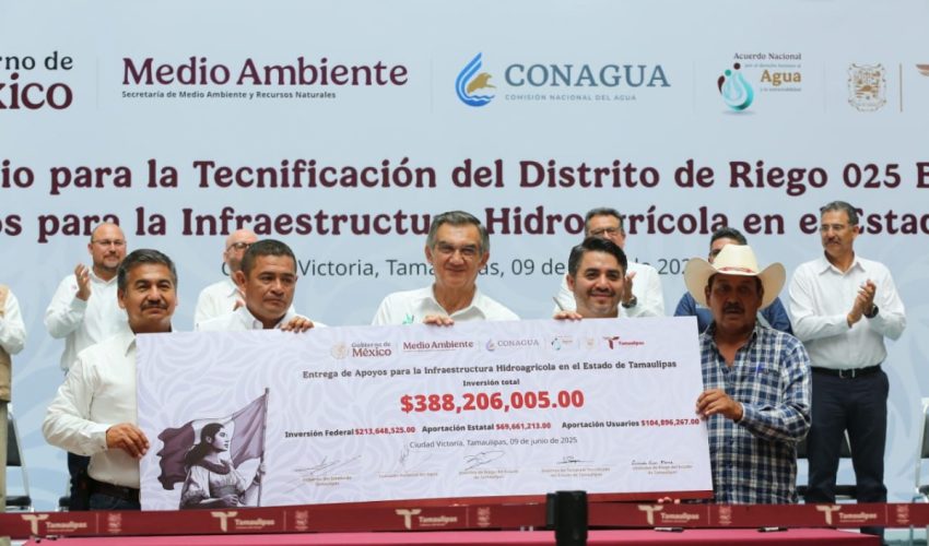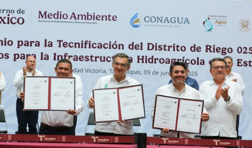 Ciudad Victoria, Tamaulipas.- En un hecho histórico y trascendental para la modernización del campo tamaulipeco, y en cumplimiento de uno de los 100 compromisos establecidos por la presidenta de México, Claudia Sheinbaum Pardo, orientado a tecnificar más de 200,000 hectáreas para riego agrícola, este lunes se firmó el Convenio para la Tecnificación del Distrito de Riego 025 Bajo Río Bravo, por el director general de la Comisión Nacional del Agua (Conagua), Efraín Morales López, y el gobernador de Tamaulipas, Américo Villarreal Anaya. Además, se llevó a cabo la Entrega de Apoyos para la Infraestructura Hidroagrícola en el estado con un monto de 388 millones 206 mil pesos.