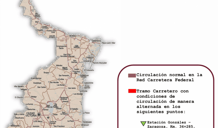 Asimismo, se sugirió a los automovilistas considerar rutas alternas si se viaja de Tampico a Victoria: González – Mante – Xicoténcatl – Zaragoza – Ciudad Victoria.