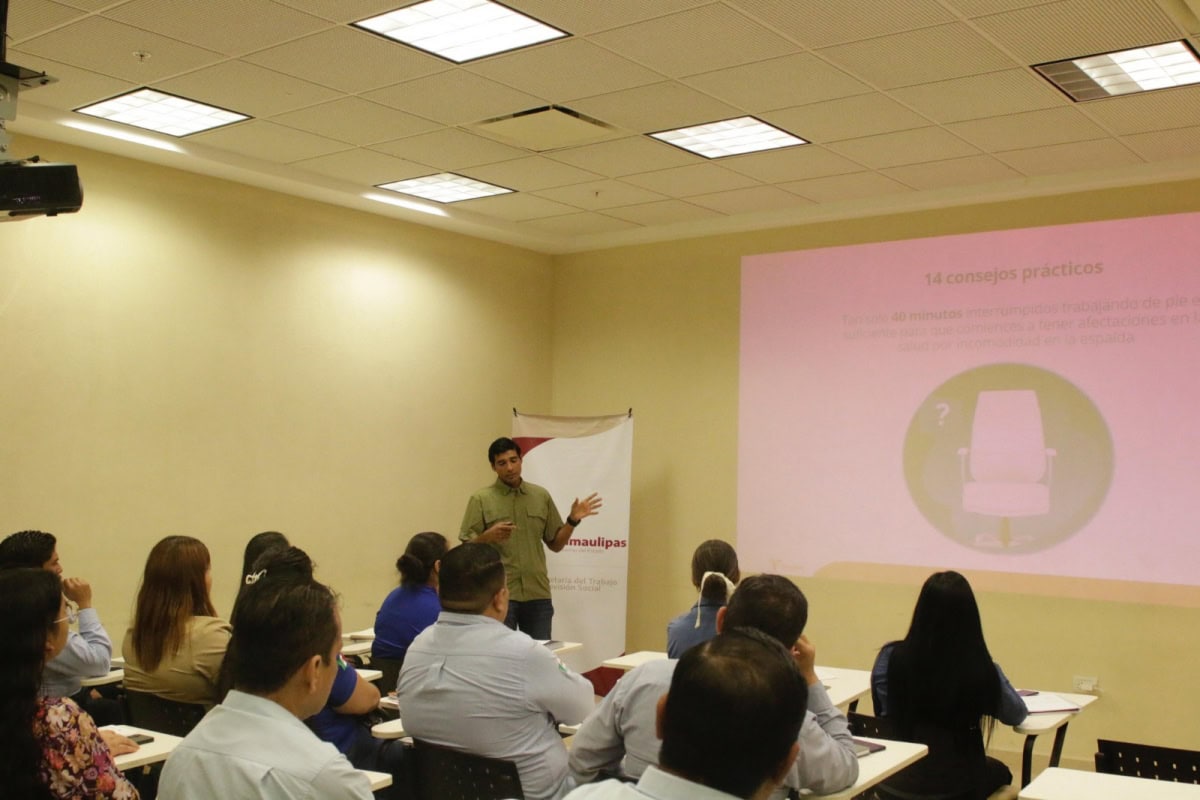 Ciudad Victoria, Tamaulipas.- Con el objetivo de fortalecer entornos laborales más seguros, dignos y saludables, la Secretaría del Trabajo y Previsión Social de Tamaulipas, que encabeza Luis Gerardo Illoldi Reyes, llevó a cabo una jornada de capacitación dirigida a diversas empresas de Ciudad Victoria sobre la conocida “Ley Silla”, enfocada en las condiciones ergonómicas en los centros de trabajo.