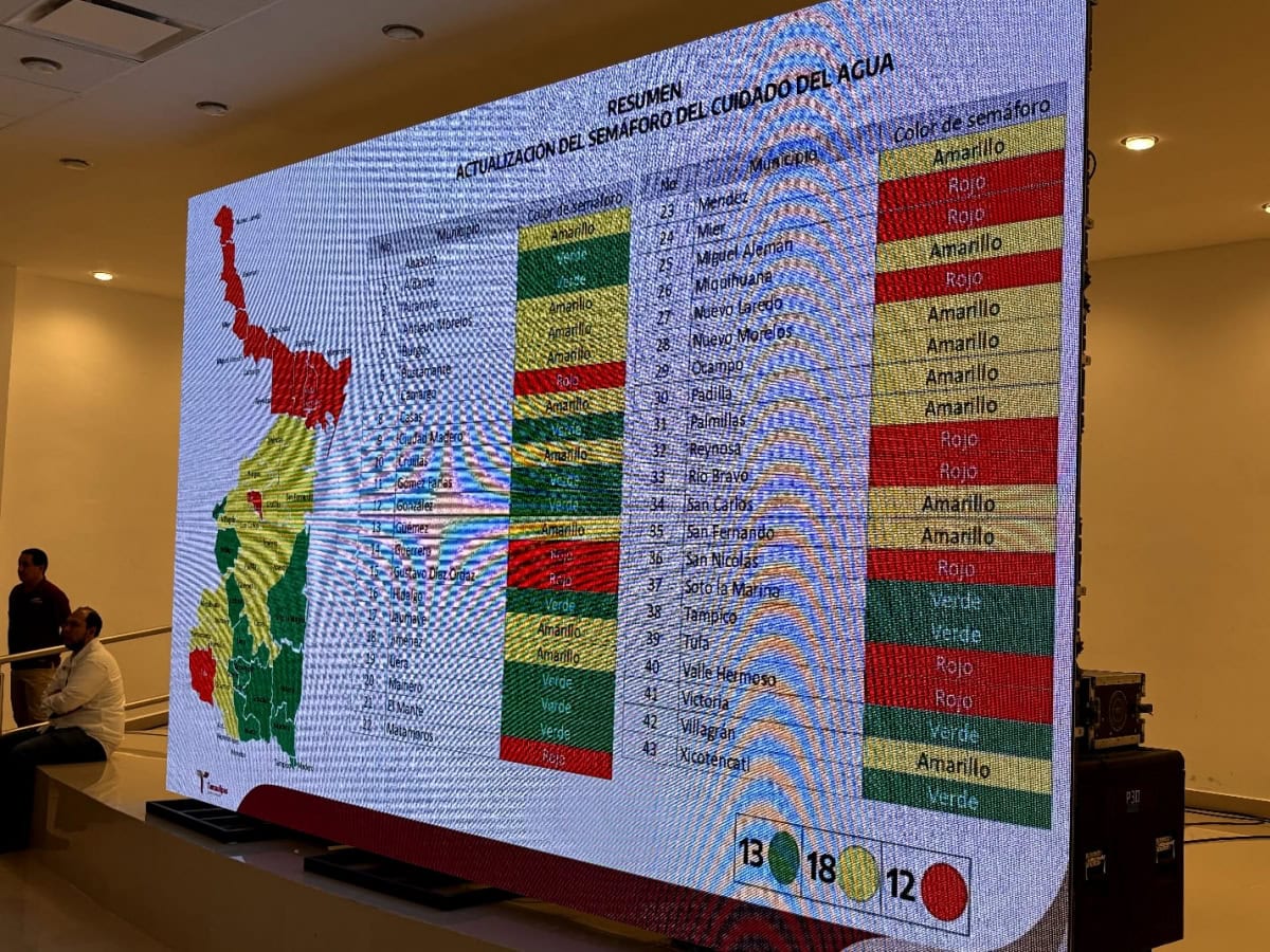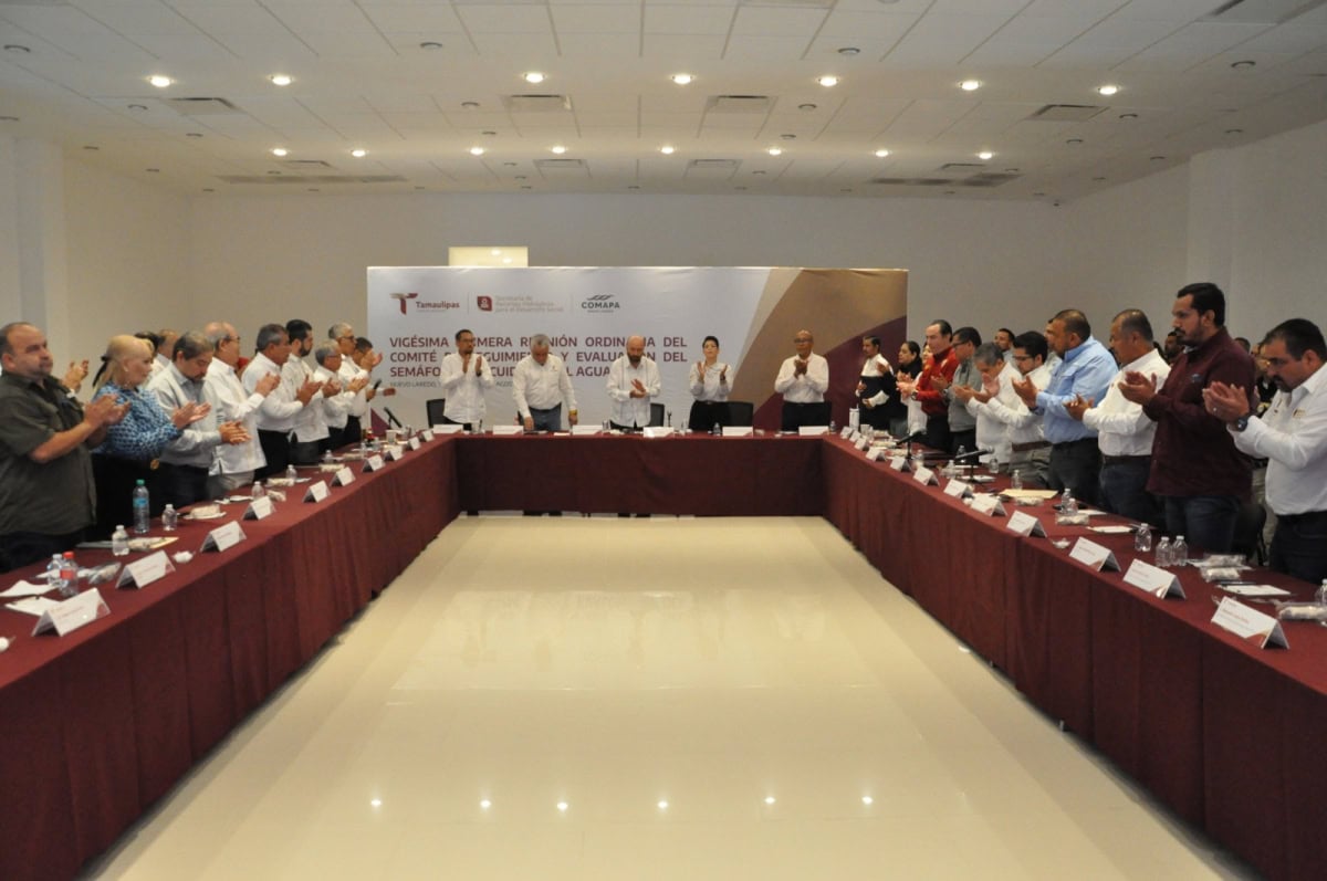 Nuevo Laredo, Tamaulipas. – Durante la vigésima primera reunión ordinaria de seguimiento y evaluación del Semáforo del Cuidado del Agua, la Secretaría de Recursos Hidráulicos de Tamaulipas presentó la actualización de colores en los 43 municipios del estado, como parte del balance hidráulico justificativo.