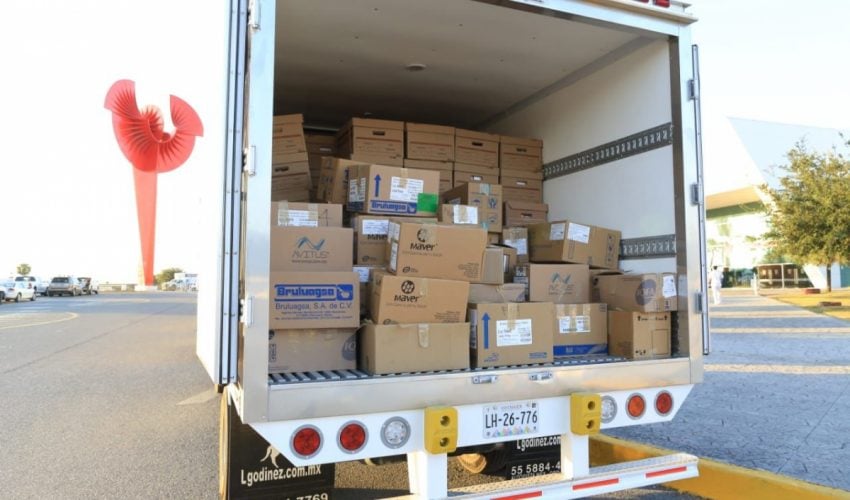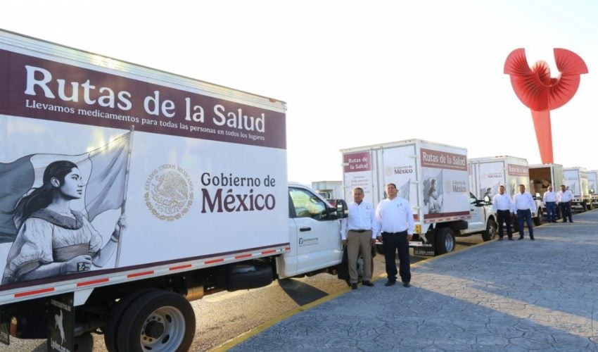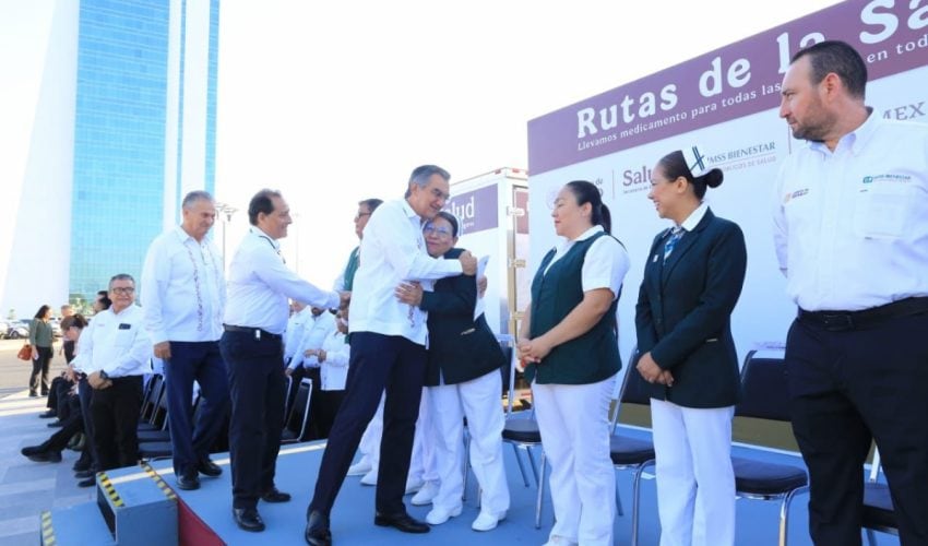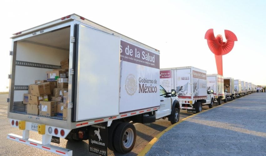Villarreal Anaya explicó que, con este histórico evento, se ponen en marcha 35 rutas con 15 camiones que transportarán más de 215 mil piezas de medicamentos para su distribución constante y efectiva a 289 centros de salud en el estado.