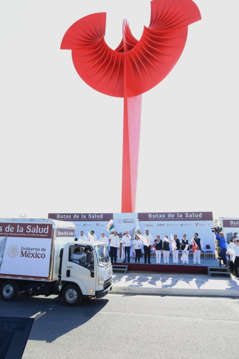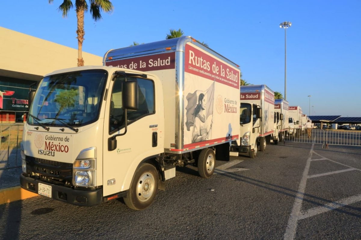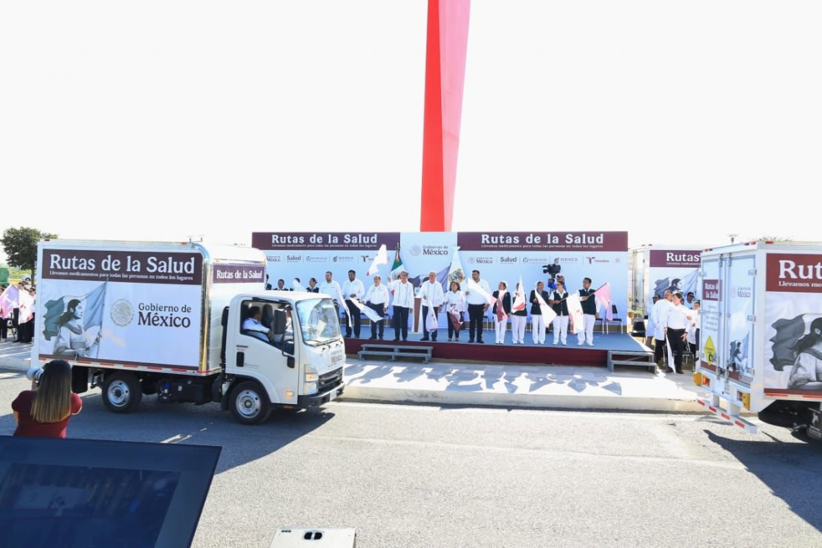 Villarreal Anaya explicó que, con este histórico evento, se ponen en marcha 35 rutas con 15 camiones que transportarán más de 215 mil piezas de medicamentos para su distribución constante y efectiva a 289 centros de salud en el estado.