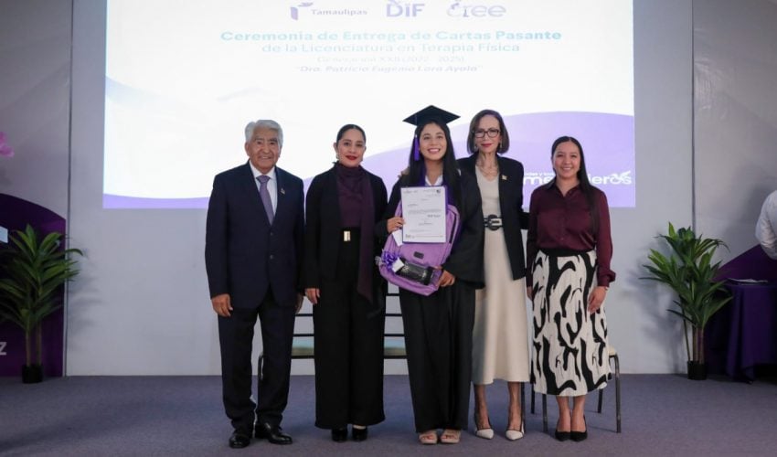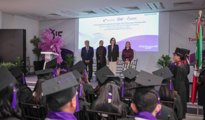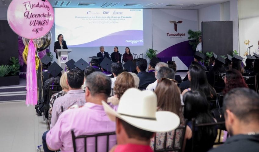Ciudad Victoria, Tamaulipas. El Sistema para el Desarrollo Integral de la Familia de Tamaulipas, que preside la doctora María de Villarreal, llevó a cabo en el auditorio principal de esta institución la ceremonia de entrega de cartas de pasante a 24 nuevos profesionistas egresados de la Licenciatura en Terapia Física del Centro de Rehabilitación y Educación Especial (CREE), dependiente de este sistema.