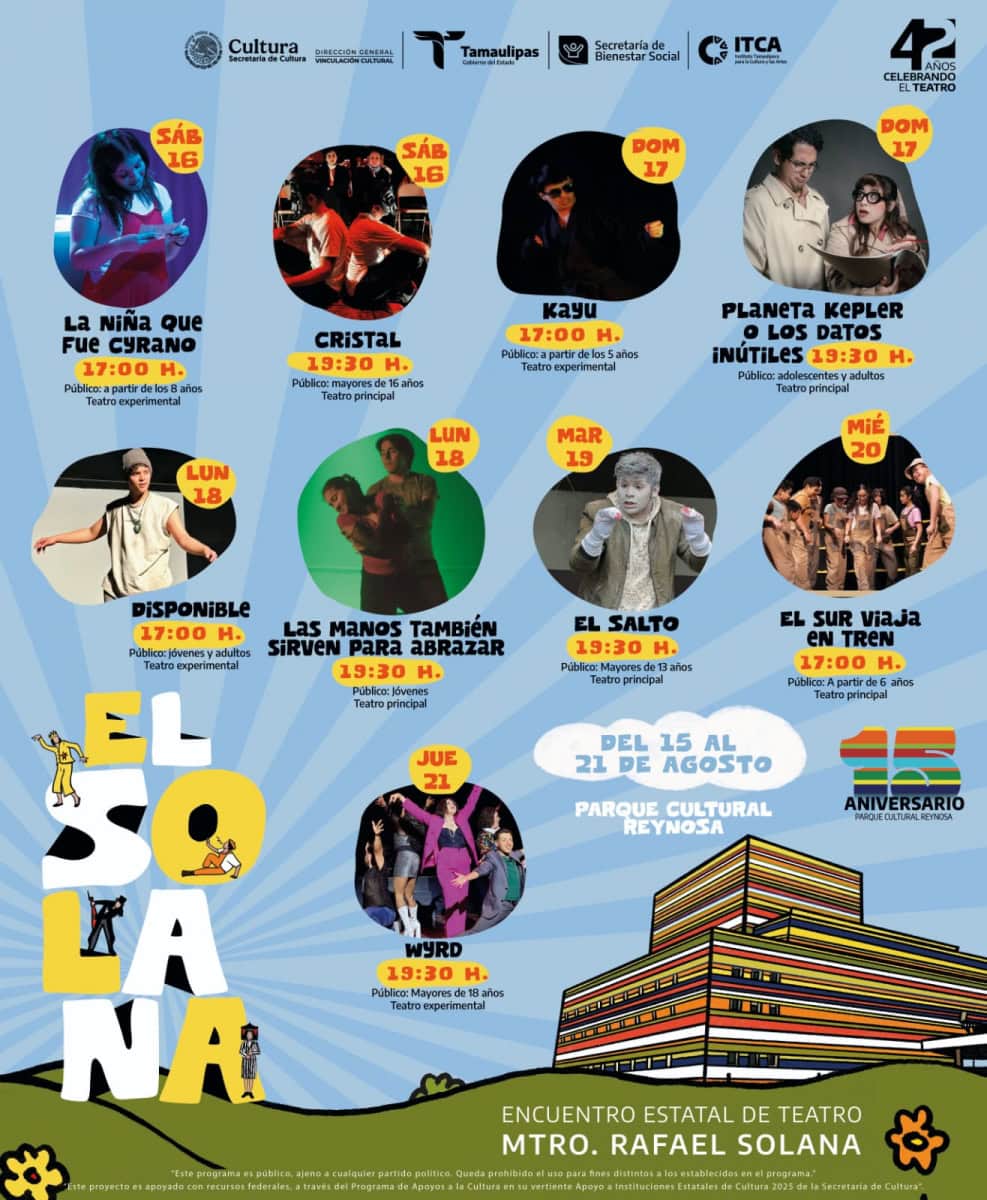 Reynosa, Tamaulipas.- Con el compromiso del gobernador Américo Villarreal Anaya de brindar espacios de formación, profesionalización y desarrollo artístico y creativo, hoy viernes 15 de agosto se inaugurará la edición 42 del Encuentro Estatal de Teatro Mtro. Rafael Solana, que durante siete días llevará al escenario del Parque Cultural Reynosa lo más destacado del teatro tamaulipeco.