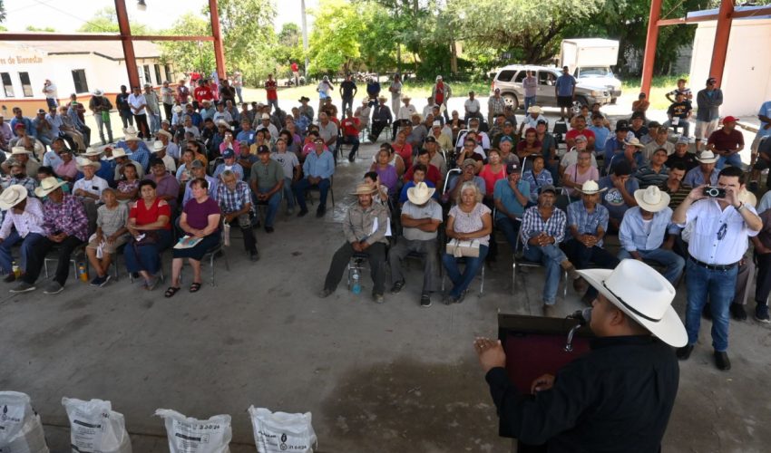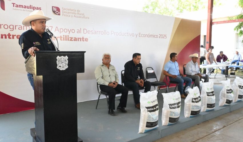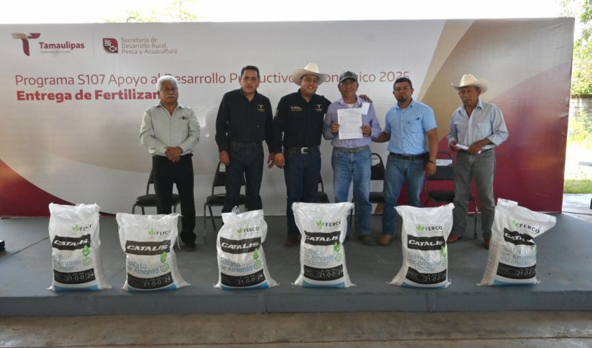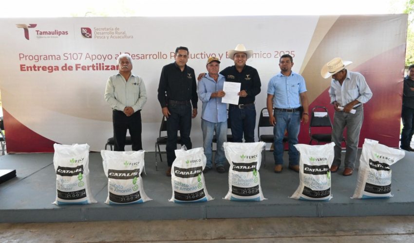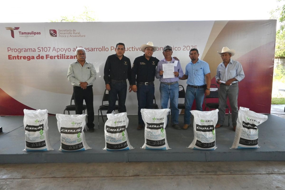 Llera, Tamaulipas. – Reafirmando el compromiso del Gobierno del Estado con el fortalecimiento del sector citrícola, la Secretaría de Desarrollo Rural, Pesca y Acuacultura llevó a cabo la entrega de más de 93 toneladas de fertilizante sulfato de amonio en beneficio de 335 productores del municipio de Llera.