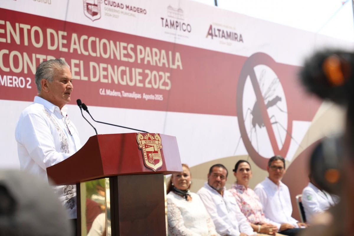 Por su parte, el presidente municipal de Ciudad Madero, Erasmo González Robledo, señaló que “cada calle limpia, cada patio libre de criaderos, cada escuela convertida en ejemplo de prevención, representa una victoria silenciosa contra esta enfermedad y el lema #PorTuBienestarUnidosContraElDengue, expresa un compromiso que va más allá de un programa gubernamental, y es ante todo, la expresión de un pacto social en la que participamos todos y unidos somos más fuertes para enfrentar el reto que representa el dengue”.