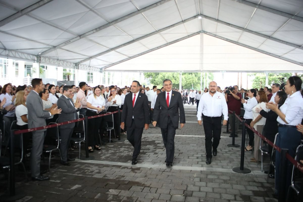 «Agradezco mucho a todos los magistrados, a todo el Poder Judicial que han acompañado esta administración del Ejecutivo en estos tres años de ejercicio, que han mostrado la voluntad y la aceptación de la voluntad popular para llevar a cabo esta transformación», expresó el mandatario estatal durante la ceremonia cívica de honores, en la explanada del Supremo Tribunal de Justicia.
