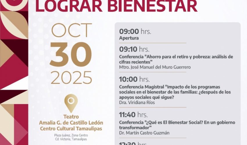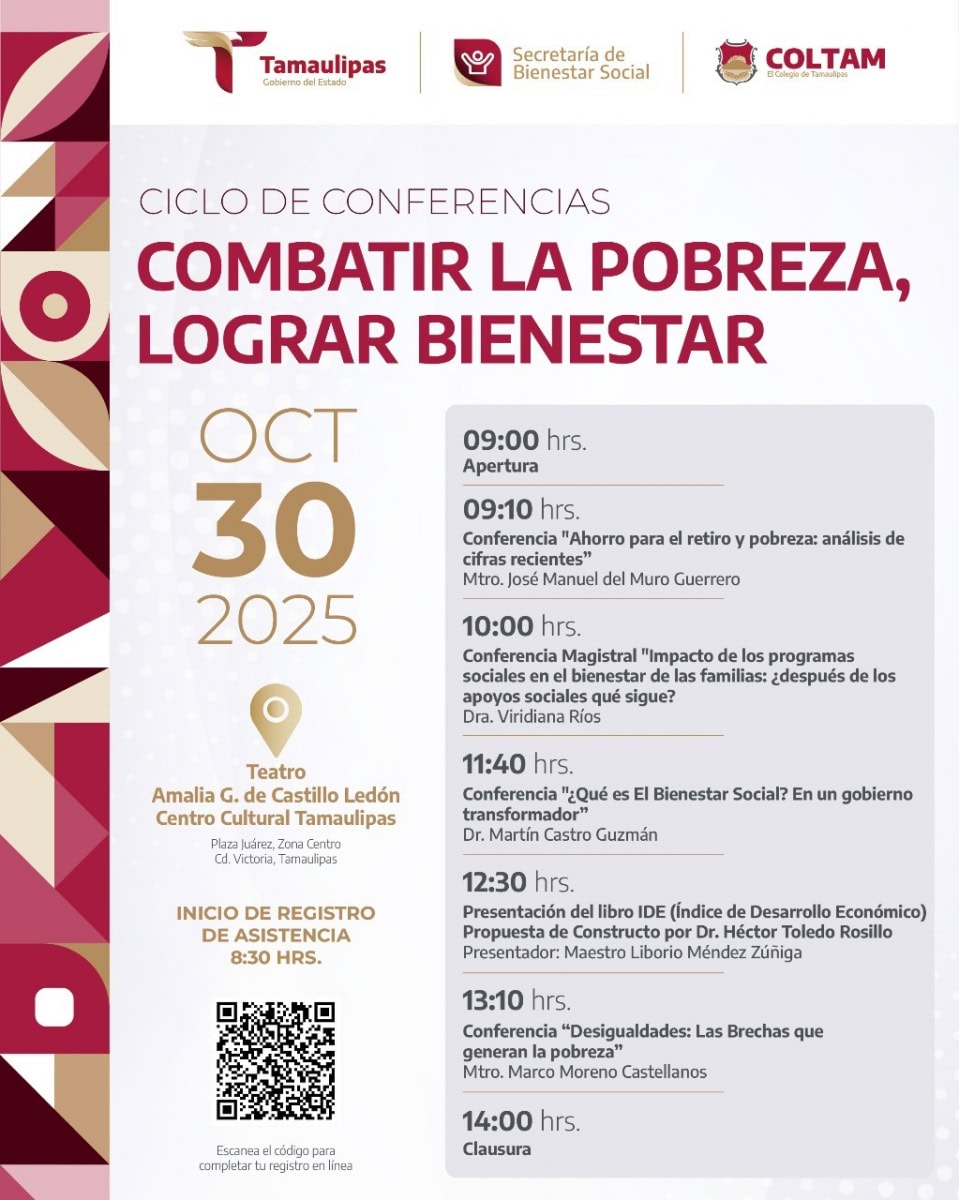 Ciudad Victoria, Tamaulipas.- El Gobierno del Estado a través de la Secretaría de Bienestar Social y el Colegio de Tamaulipas, organizan el ciclo de conferencias “Combatir la Pobreza, Lograr Bienestar”, que se desarrollará el 31 de octubre en el Teatro Amalia G. de Castillo Ledón, a partir de las 9:00 horas.