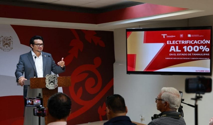 Ciudad Victoria, Tamaulipas.- En conferencia de prensa, el secretario de Desarrollo Energético, Walter Julián Ángel Jiménez, presentó el avance del programa “Electrificación al 100%”, donde señaló que Tamaulipas se convertirá en el primer estado del país en concretar la electrificación en todo el territorio.
