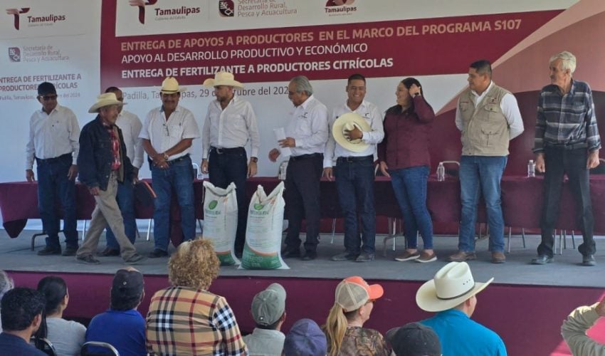 Agregó que, para apoyar a productores citrícolas de la zona centro del estado y consolidar el liderazgo de Tamaulipas en este sector, se destinaron 15 millones de pesos para apoyar con 674.375 toneladas de fertilizante granulado para su aplicación en las unidades de producción, beneficiando a 2,190 personas productoras citrícolas de 6 municipios tamaulipecos.