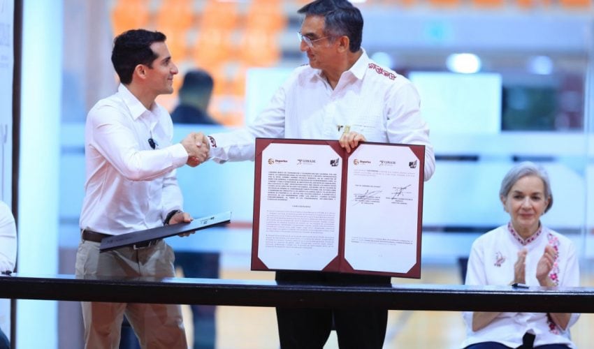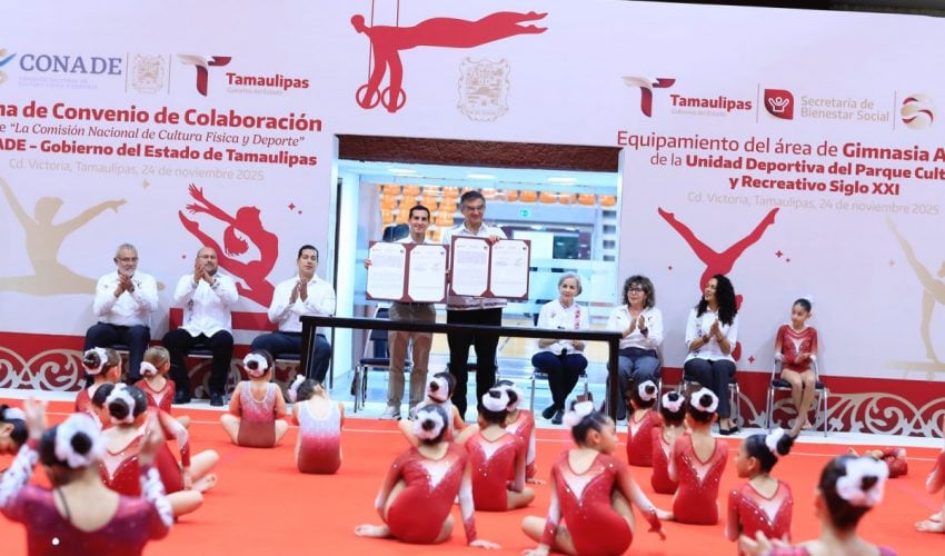 Ciudad Victoria, Tamaulipas.- En el marco de la reinauguración del área de Gimnasia Artística de la Unidad Deportiva Siglo XXI, el director general de la Comisión Nacional de Cultura Física y Deporte (Conade), Rommel Pacheco, y el gobernador Américo Villarreal Anaya firmaron un Convenio de Colaboración para impulsar la promoción y el desarrollo de programas y acciones que fomenten actividades físicas y deportivas.