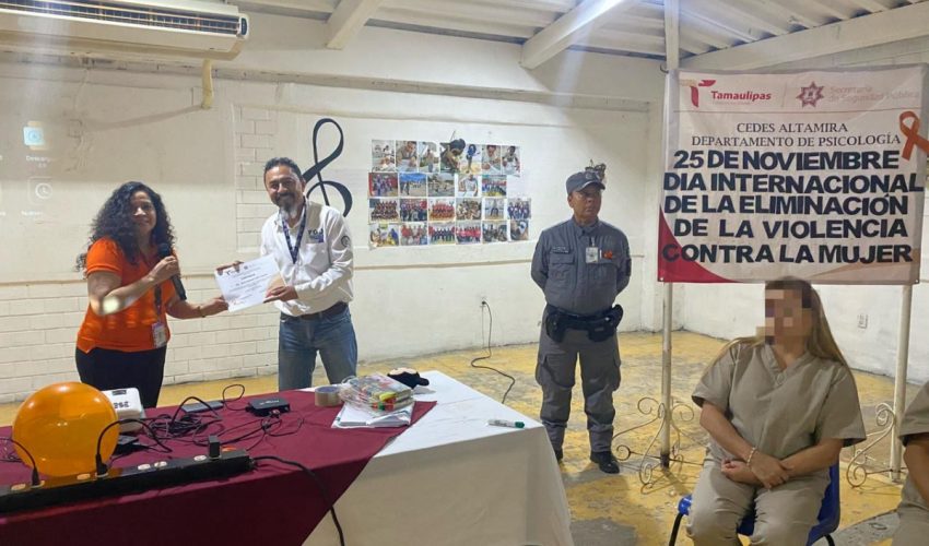 Altamira, Tamaulipas. – Entre las actividades conmemorativas del Día Internacional para la Eliminación de la Violencia contra las Mujeres, desempeñadas por la Secretaría de Seguridad Pública de Tamaulipas (SSPT) el Centro de Ejecución de Sanciones (CEDES) del municipio de Altamira llevó a cabo un torneo relámpago de voleibol y una conferencia a cargo del psicólogo de la Fiscalía General de Justicia del Estado de Tamaulipas (FGJT), Juan Gabriel Solís Tavera.