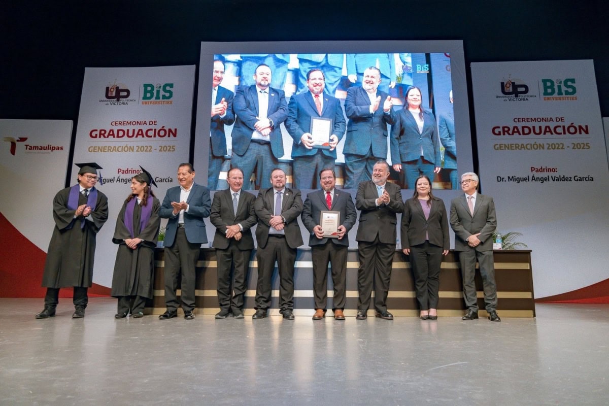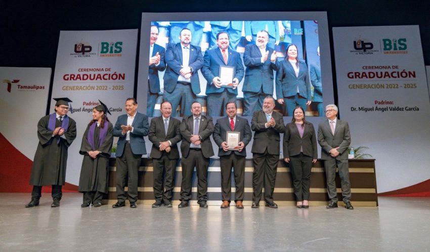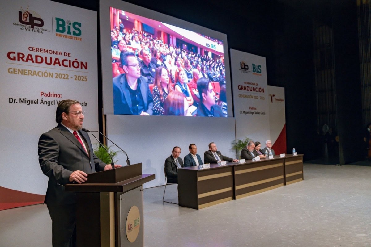 Ciudad Victoria, Tamaulipas.– Poner al servicio de la sociedad sus conocimientos, capacidades y talentos desarrollados durante su formación profesional, fue el llamado que hizo Miguel Ángel Valdez García, secretario de Educación de Tamaulipas, a las y los graduados de las diferentes carreras que conforman la Generación 2022–2025 de la Universidad Politécnica de Victoria (UPV), de la cual fue padrino.