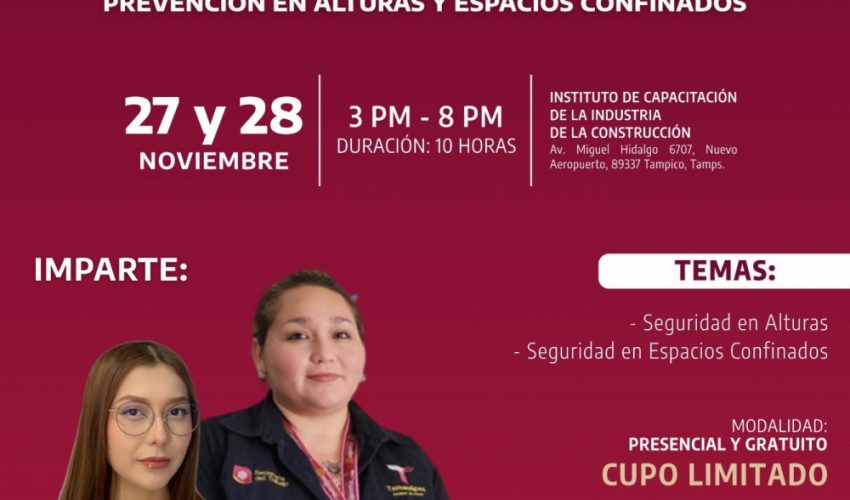 El curso, que se llevará a cabo los días 27 y 28 de noviembre, en un horario de 3:00 a 8:00 PM, tendrá como sede el Instituto de Capacitación de la Industria de la Construcción ubicado en el Nuevo Aeropuerto de Tampico. La capacitación será presencial, gratuita y con cupo limitado, con el objetivo de asegurar una atención especializada a cada participante.