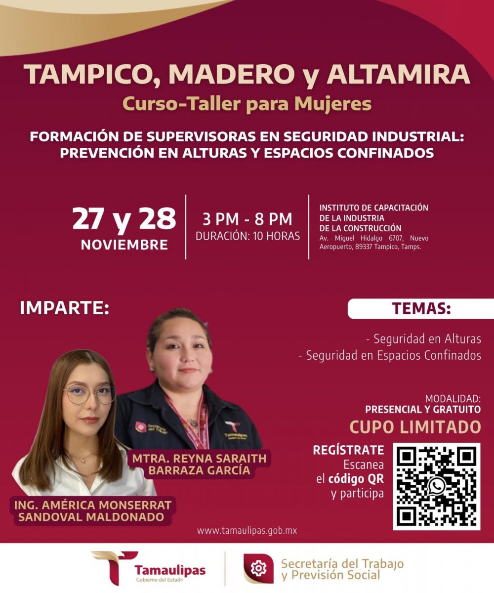 Tampico, Tamaulipas.- La Secretaría del Trabajo y Previsión Social de Tamaulipas anunció la realización del Curso-Taller para Mujeres “Formación de Supervisoras en Seguridad Industrial: Prevención en Alturas y Espacios Confinados”, dirigido a mujeres de Tampico, Ciudad Madero y Altamira que buscan profesionalizarse y fortalecer sus competencias dentro del sector industrial.