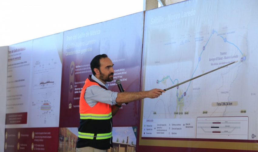 Durante el evento, Andrés Lajous detalló que el tramo Arroyo El Sauz-Nuevo Laredo del tren Golfo de México tiene 136.48 kilómetros de vía sencilla, contará con 52 puentes ferroviarios, 42 pasos vehiculares y 108 obras de drenaje, y tendrá tiempos de recorrido hacia Nuevo Laredo de menos de dos horas desde Monterrey y de tres horas y media desde Saltillo.