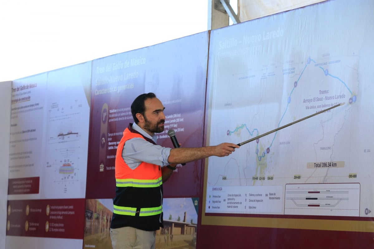Durante el evento, Andrés Lajous detalló que el tramo Arroyo El Sauz-Nuevo Laredo del tren Golfo de México tiene 136.48 kilómetros de vía sencilla, contará con 52 puentes ferroviarios, 42 pasos vehiculares y 108 obras de drenaje, y tendrá tiempos de recorrido hacia Nuevo Laredo de menos de dos horas desde Monterrey y de tres horas y media desde Saltillo.