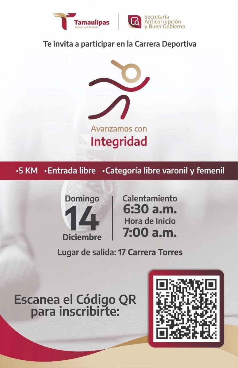 Ciudad Victoria, Tamaulipas.- Como parte de las actividades conmemorativas de la Semana Internacional contra la Corrupción, que se conmemora el próximo mes de diciembre, la Secretaría Anticorrupción y Buen Gobierno del Estado de Tamaulipas, invita a la ciudadanía, personas servidoras públicas y comunidad estudiantil a sumarse a la carrera “Avanzamos con Integridad”, que se llevará a cabo el próximo domingo 14 de diciembre.