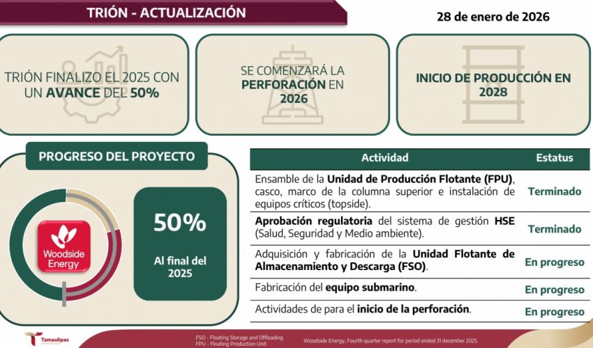 Ciudad Victoria, Tamaulipas.- La empresa Woodside Energy informó que, al cierre del año 2025, cuenta con un avance del 50% del Campo Trion, el cual se desarrolla frente a las costas tamaulipecas, considerado el primer campo petrolero de aguas profundas en México.