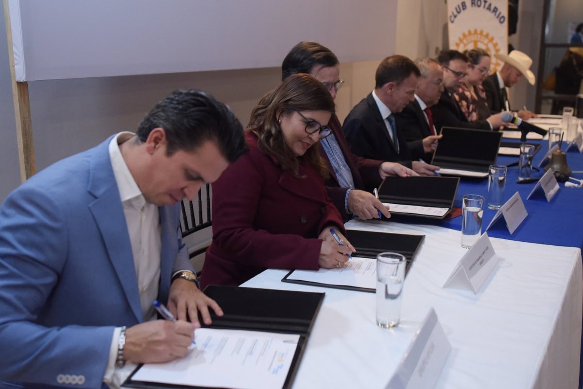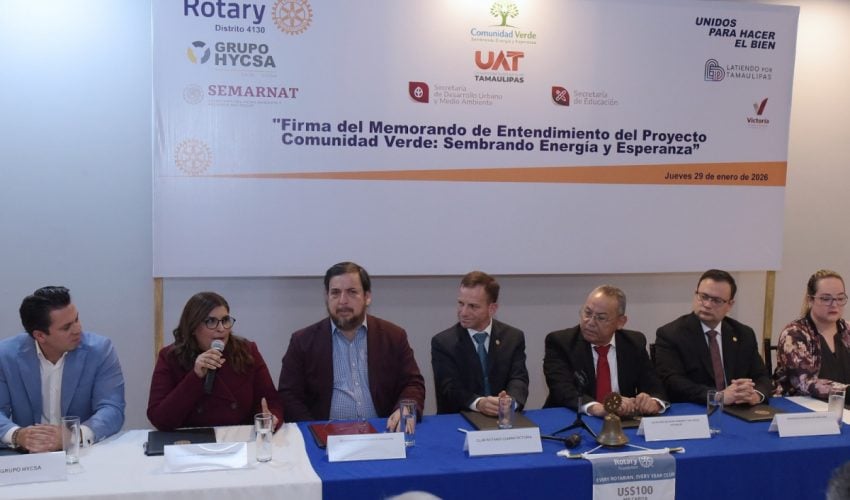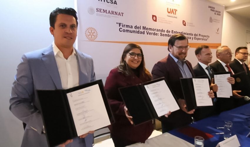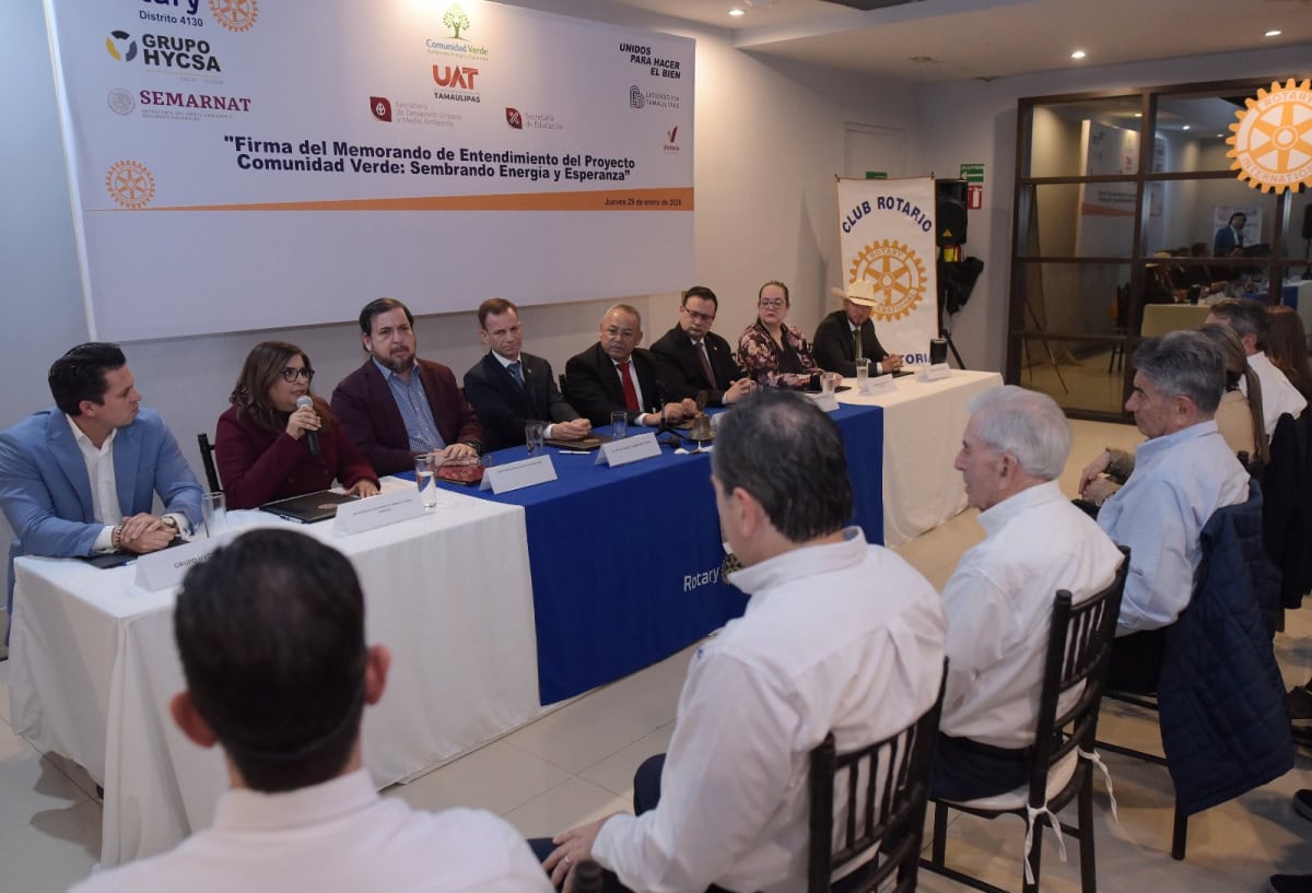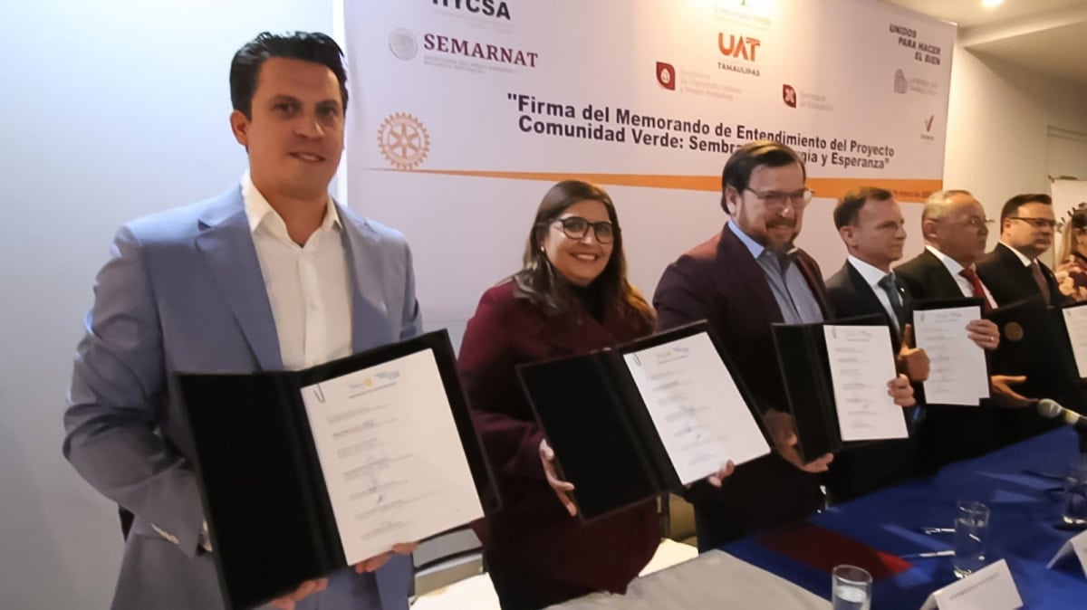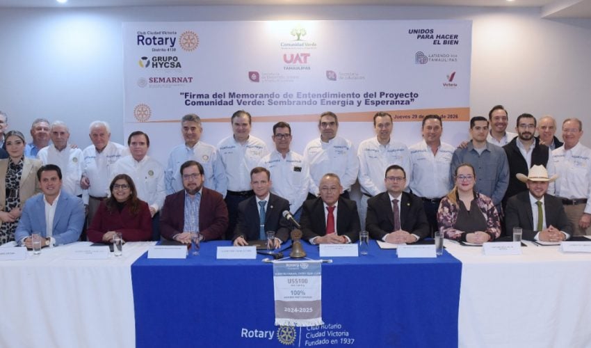 En ese marco, se llevó a cabo la firma del convenio de colaboración del proyecto Comunidad Verde, una alianza estratégica encabezada por el Club Rotary Ciudad Victoria, junto con la Secretaría de Desarrollo Urbano y Medio Ambiente (SEDUMA), la Secretaría de Educación de Tamaulipas (SET), la Universidad Autónoma de Tamaulipas (UAT), la SEMARNAT, el Gobierno municipal de Victoria, la asociación civil Latiendo por Tamaulipas y el Grupo HYCSA.