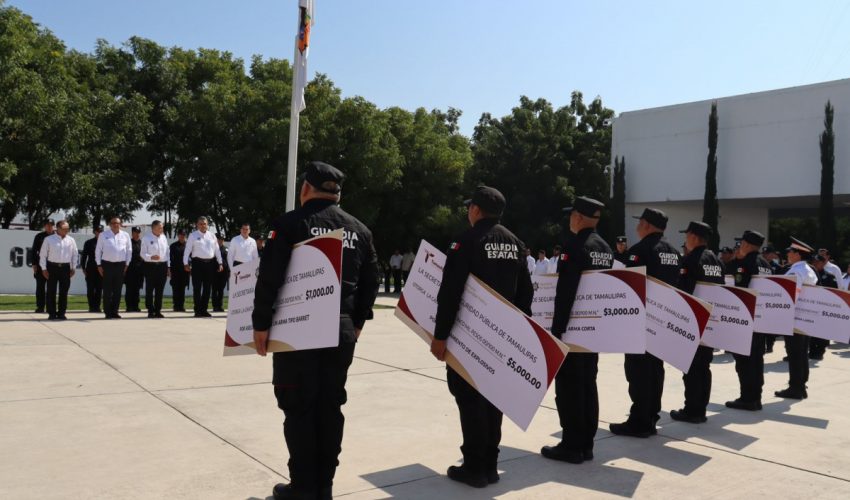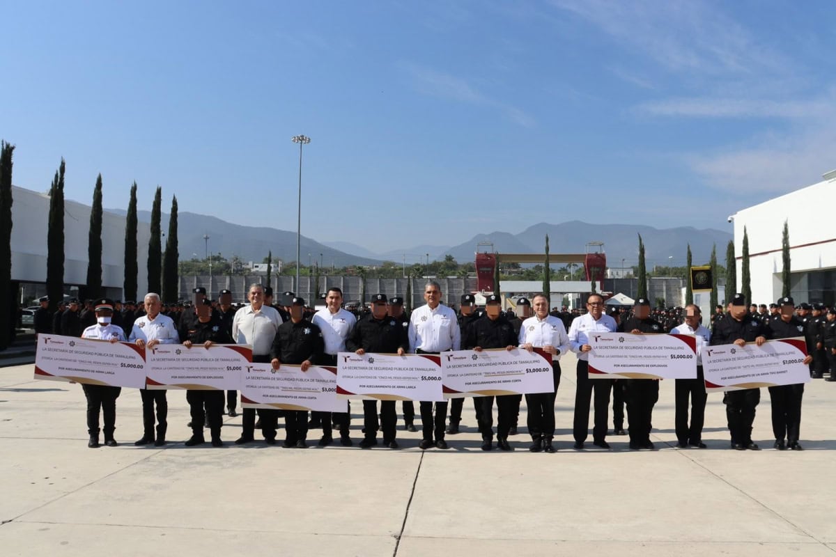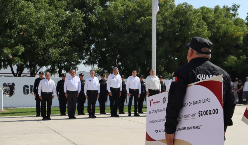 Con una ceremonia encabezada por el secretario de Seguridad Pública de Tamaulipas, Carlos Arturo Pancardo Escudero, se recibió a los siete elementos galardonados, entre ellos, una integrante de la Dirección de Tránsito Estatal, quienes durante el pasado mes aseguraron 14 armas largas, cinco armas cortas y cuatro explosivos.