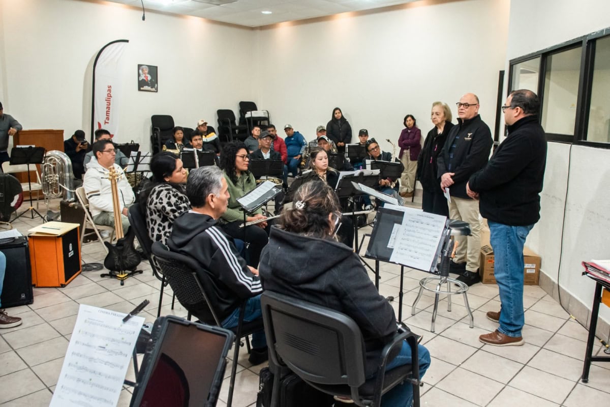 Acompañado de la Mtra. Nicolina Sarno, directora de Educación y Desarrollo Artístico del Instituto, el director general del ITCA expresó su gratitud a los integrantes de la banda por la dedicación y talento que ponen al servicio de las y los tamaulipecos, agregando que será un año de celebración con una serie de eventos y acciones, ya que este 2026 se conmemora el aniversario 125 de esta institución musical en el estado.