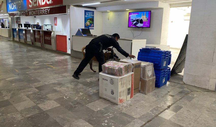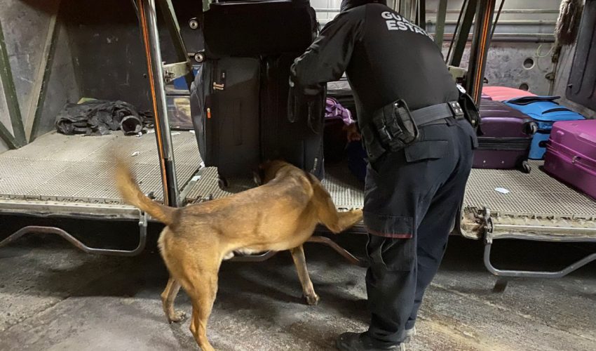 Durante la intervención, el canino “Looky” realiza barridos preventivos en pasillos, sala de espera, andenes, áreas comunes y la zona de paquetería, además de la inspección de maletas y autobuses de distintas líneas de transporte foráneo.