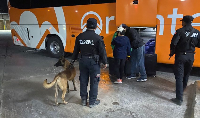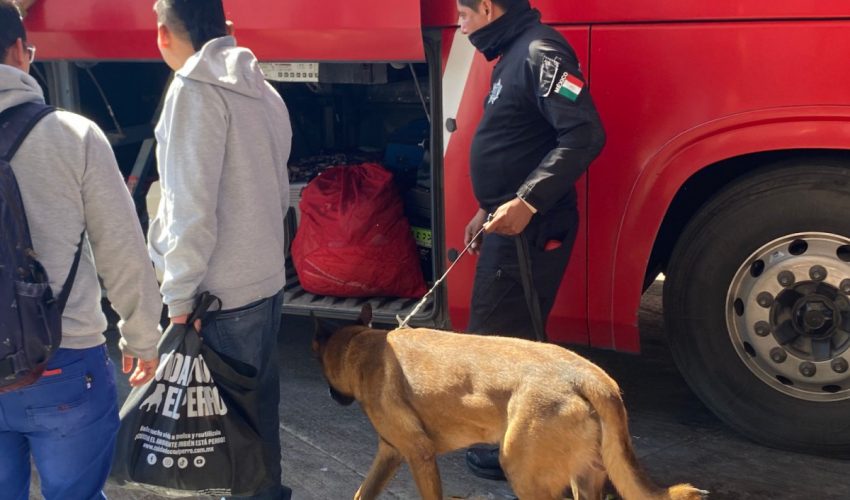 Ciudad Victoria, Tamaulipas.– Como parte de las acciones de prevención y disuasión del delito, personal de la Dirección de Agrupamientos Policiales de la Guardia Estatal lleva a cabo un operativo de inspección en la Central de Autobuses, con el apoyo de un binomio canino especializado en la detección de narcóticos.
