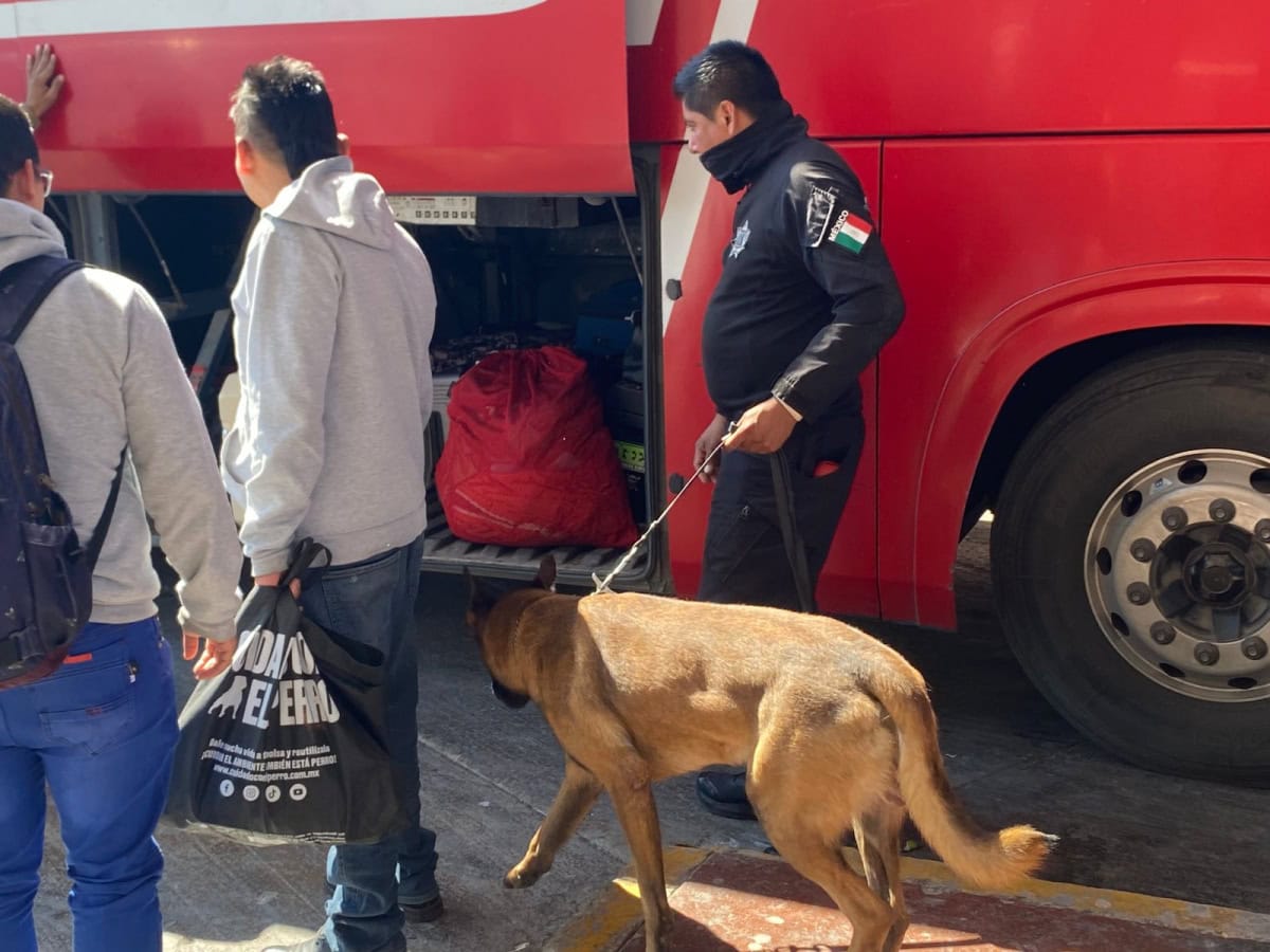 Durante la intervención, el canino “Looky” realiza barridos preventivos en pasillos, sala de espera, andenes, áreas comunes y la zona de paquetería, además de la inspección de maletas y autobuses de distintas líneas de transporte foráneo.