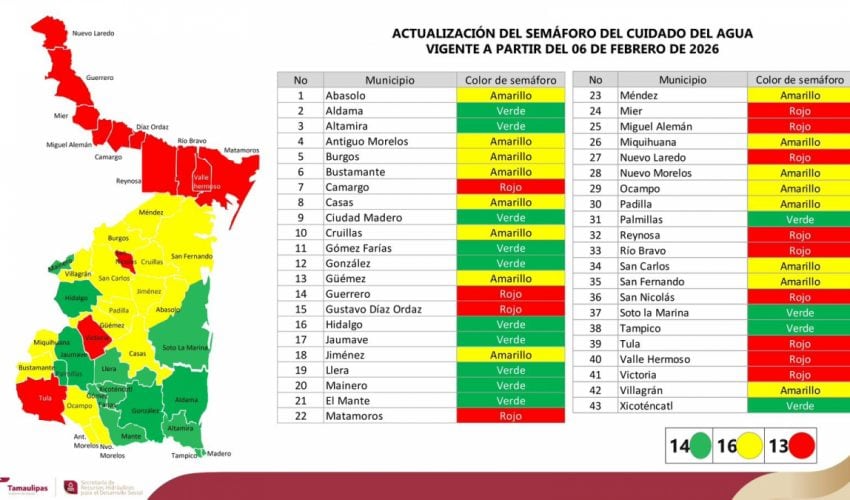 En color rojo permanecen: Camargo, Guerrero, Gustavo Díaz Ordaz, Matamoros, Mier, Miguel Alemán, Nuevo Laredo, Reynosa, Río Bravo, San Nicolás, Tula, Valle Hermoso y Victoria.